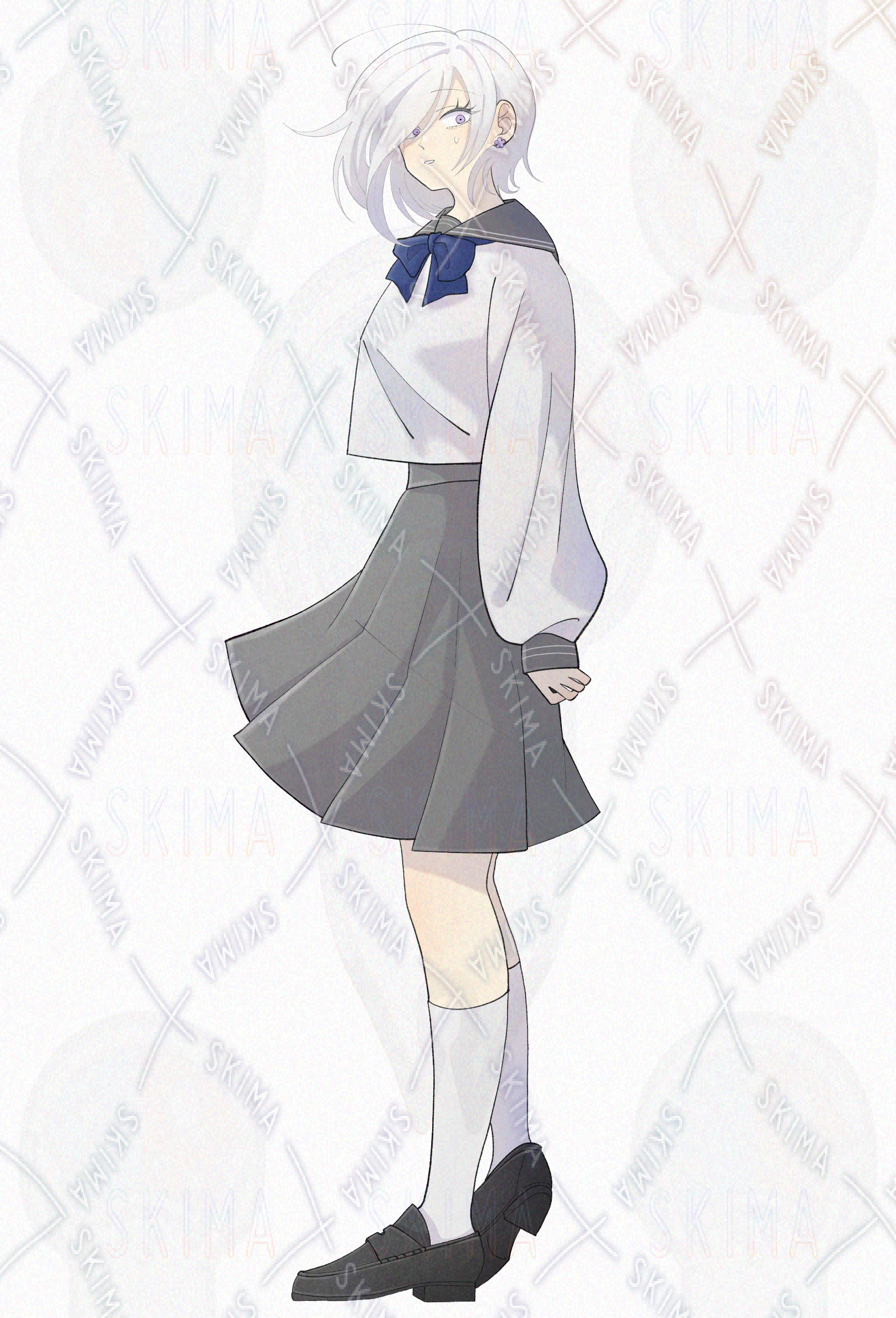 現代/学生/ショートヘア/ボブヘア/メカクレ/白髪/銀髪/制服/ローファー/リボン