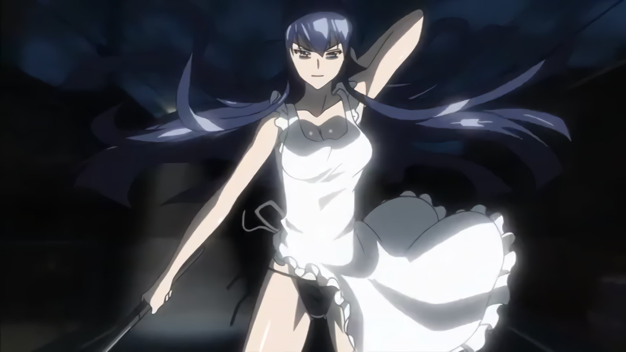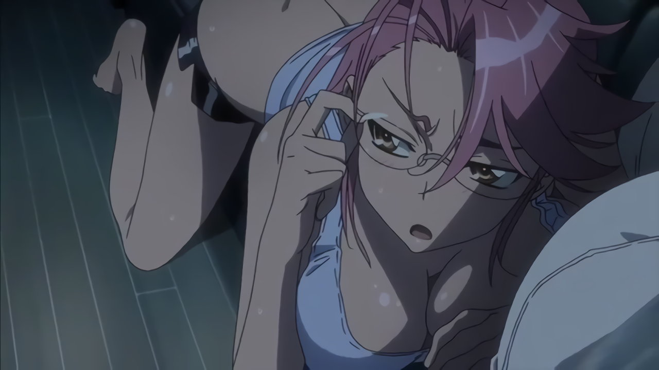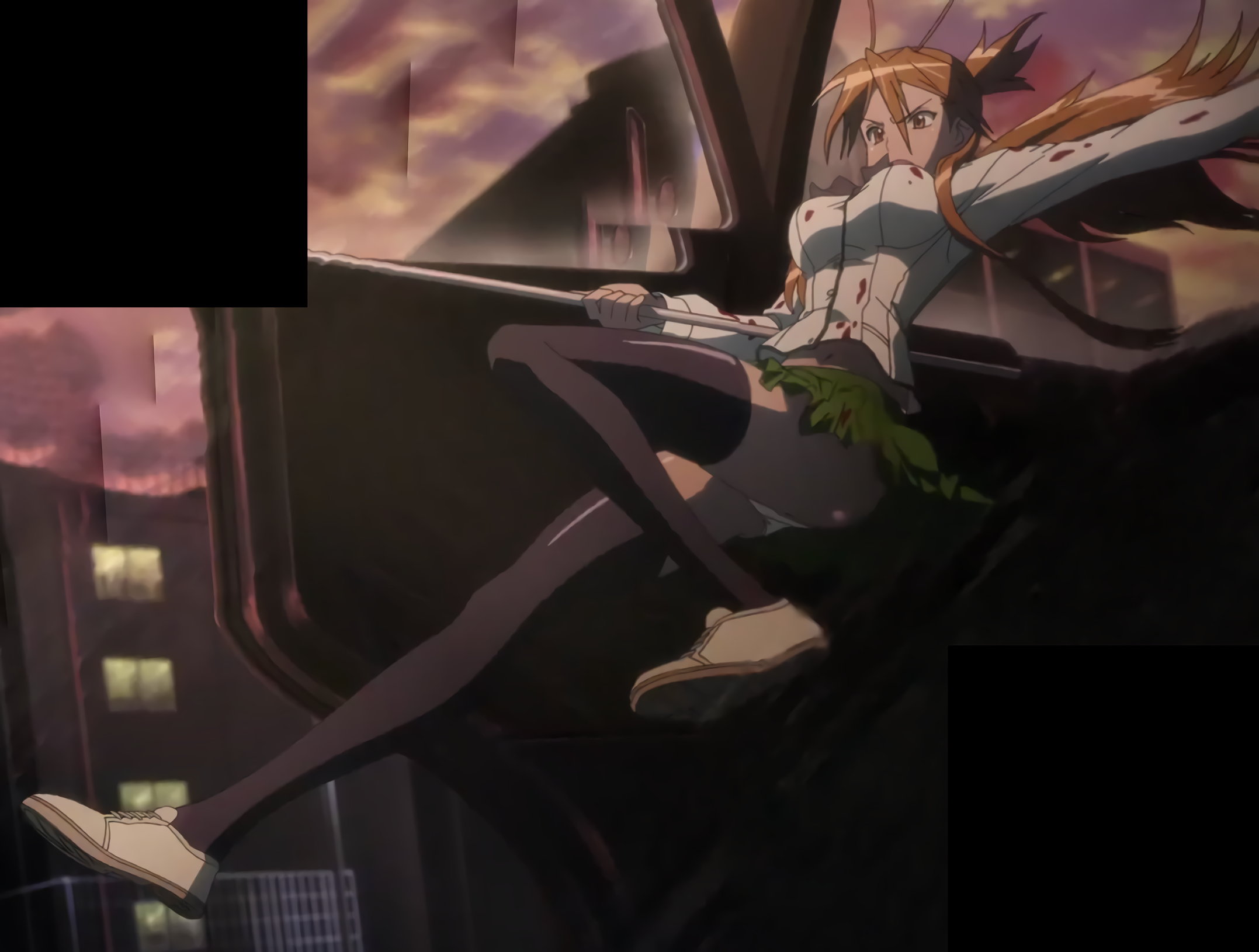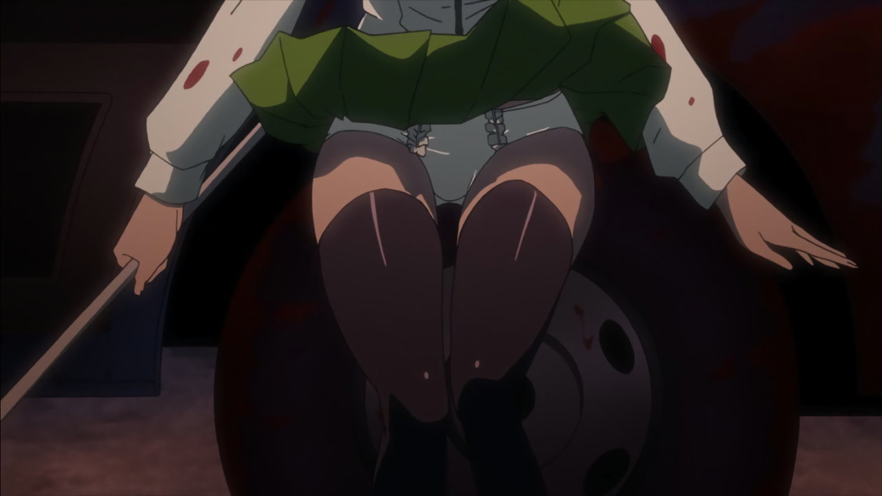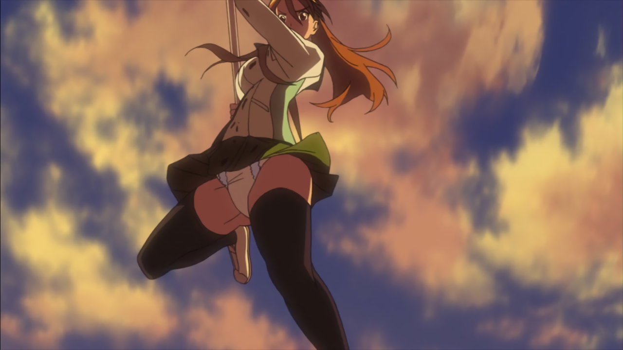 バスの車内で暴れる角田をモップの柄で一突きする麗のパンチラ。