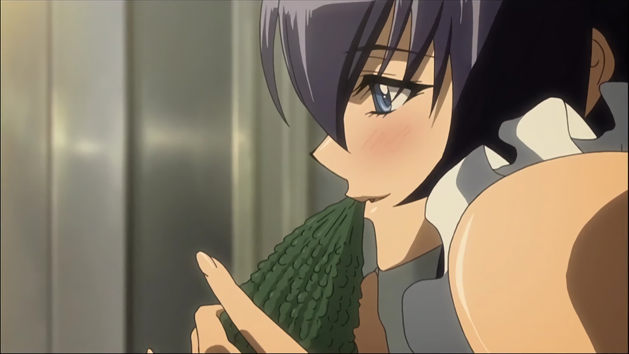 冷蔵庫を物色し、発見した苦瓜を咥える、裸エプロンの冴子。