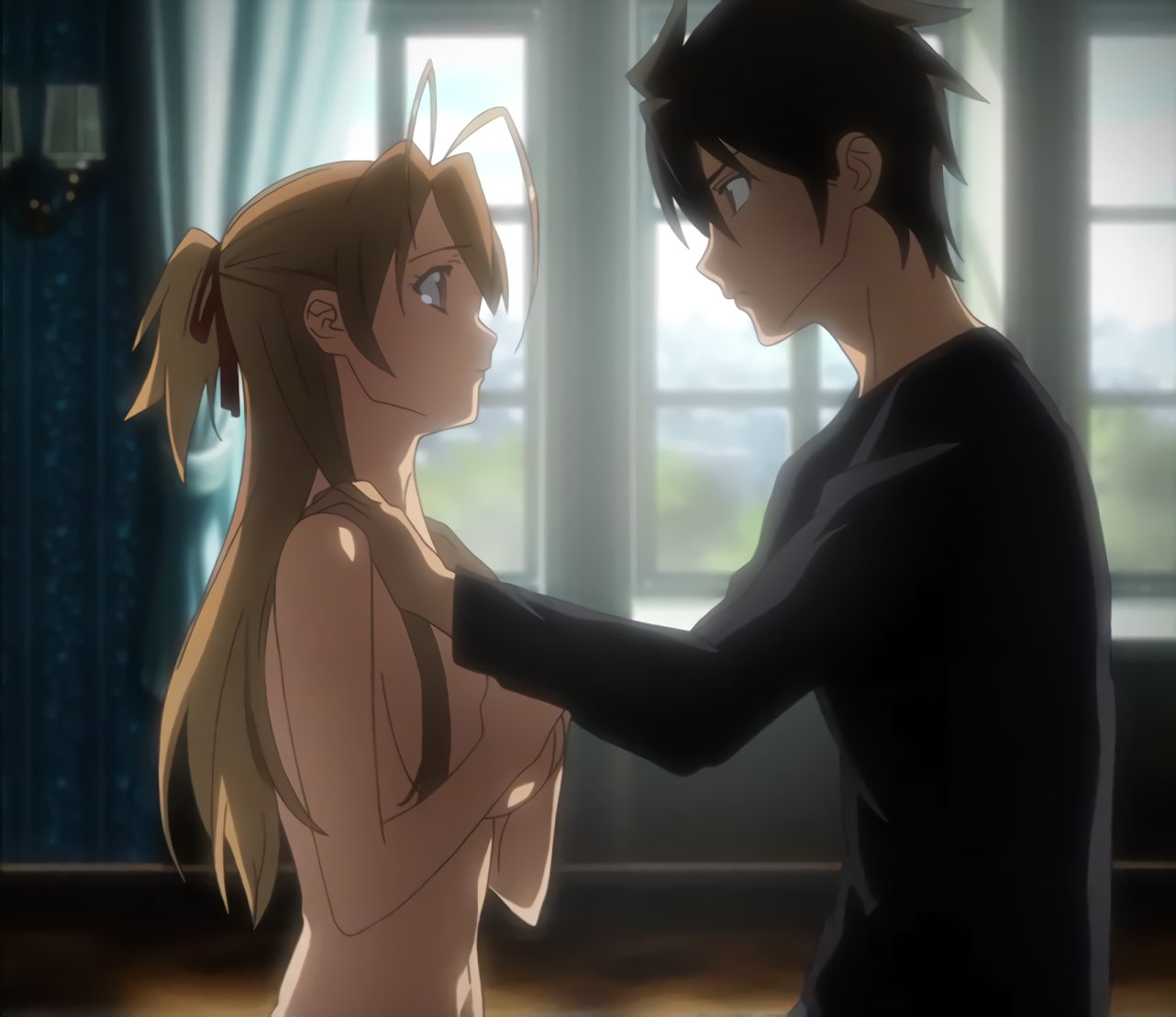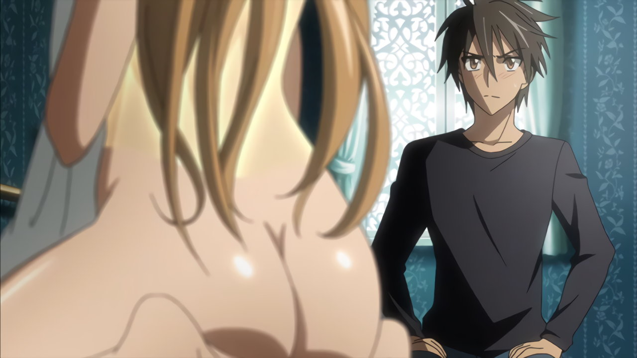 孝の背後で制服を脱ぐ冴子。