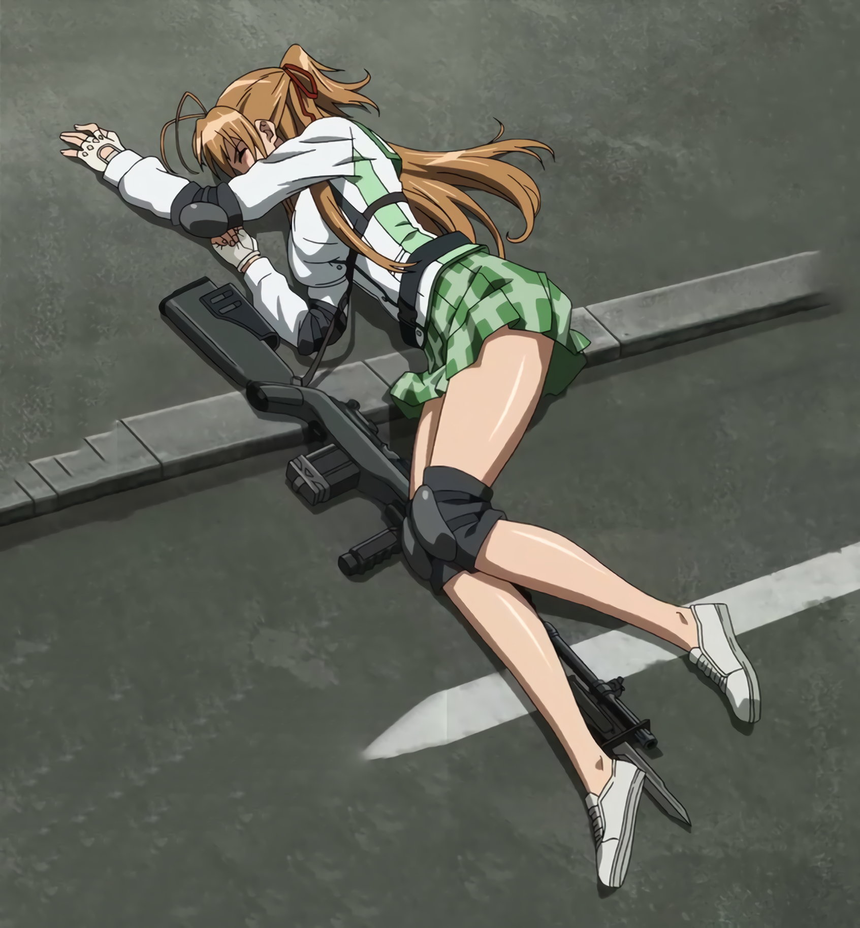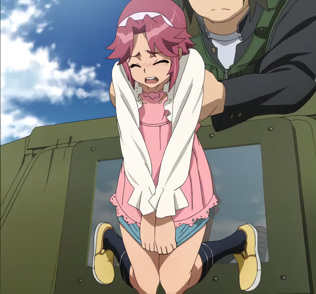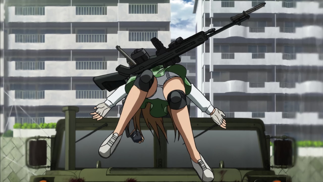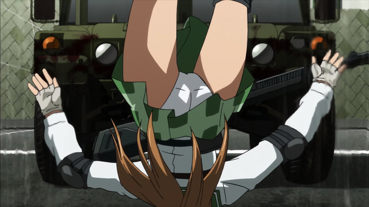 ハンヴィーの車体から振り落とされ、パンチラしながら地面に転げ落ちる麗。