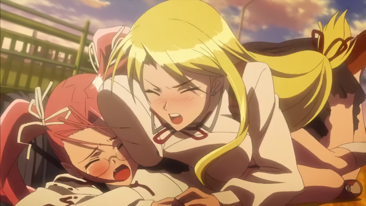 静香に押し倒され、巨乳が顔面を直撃する沙耶。