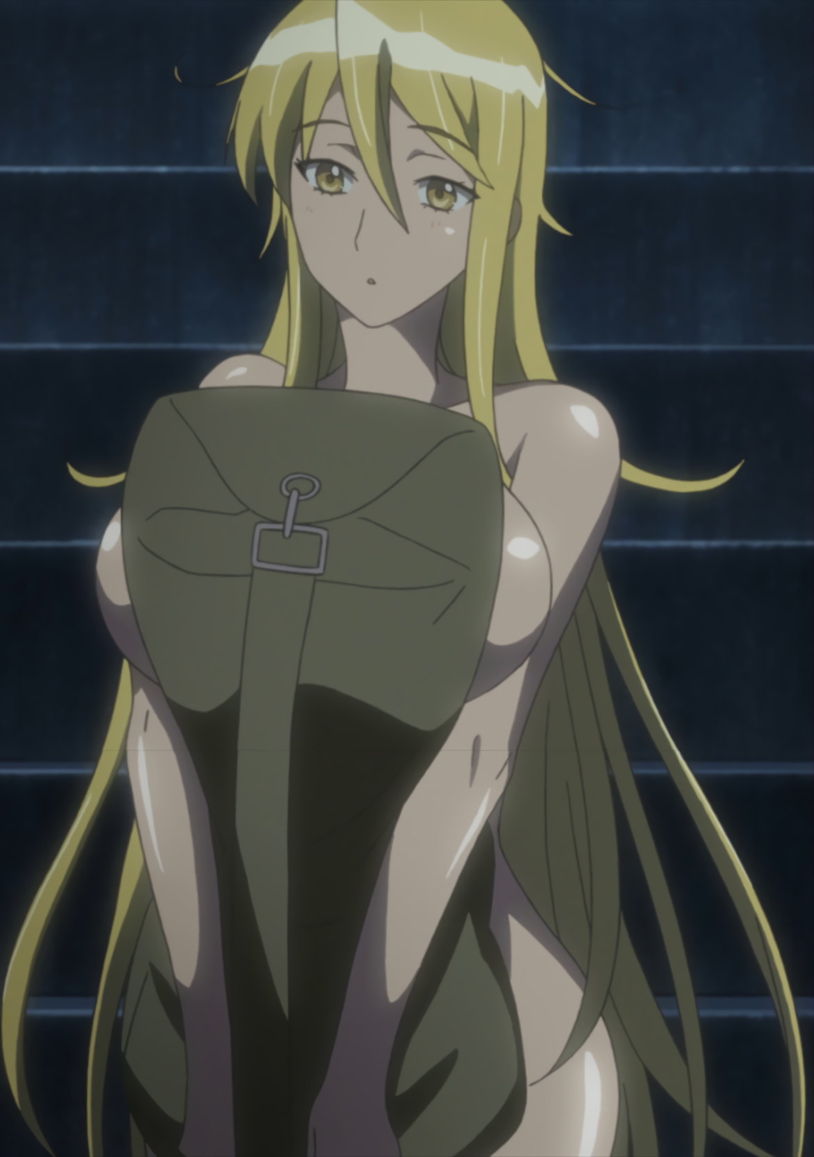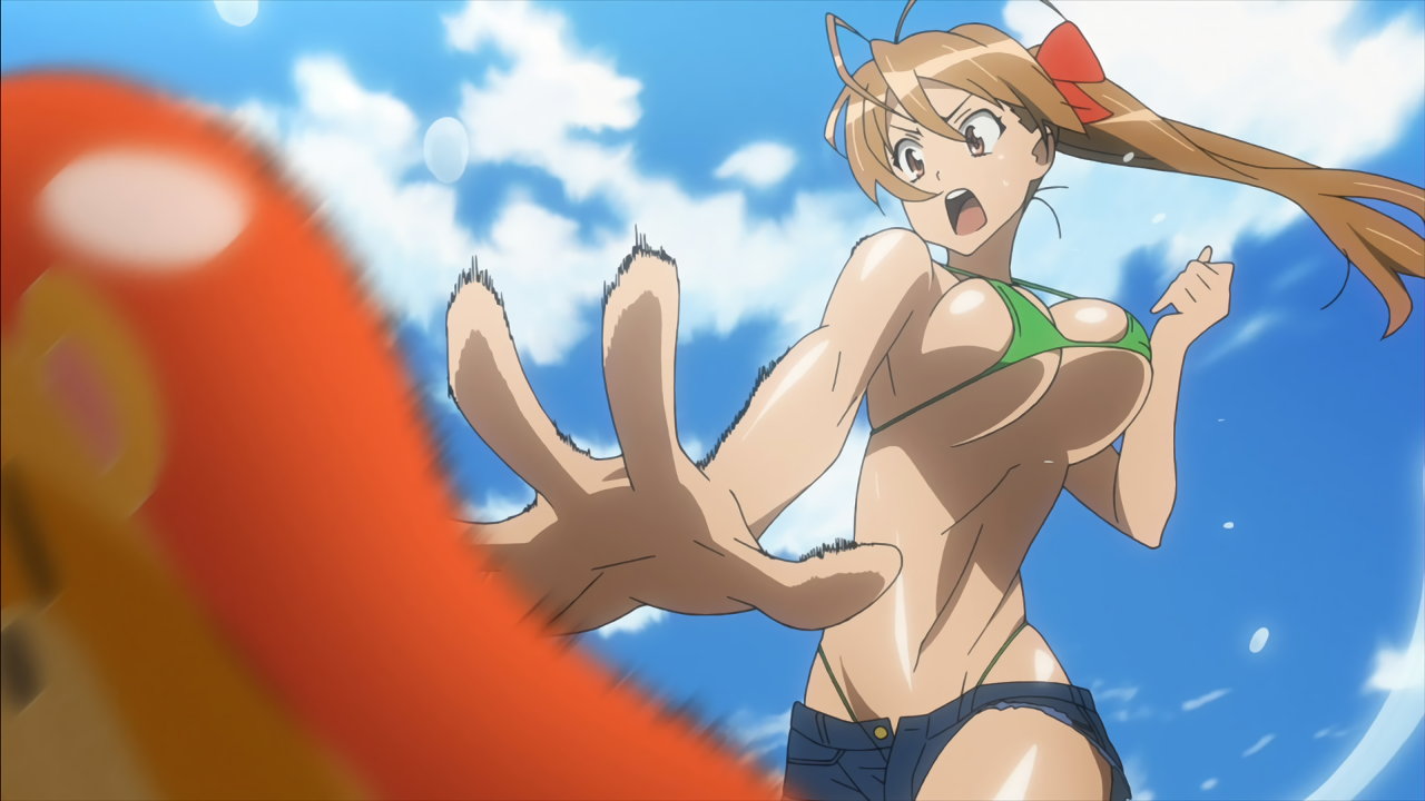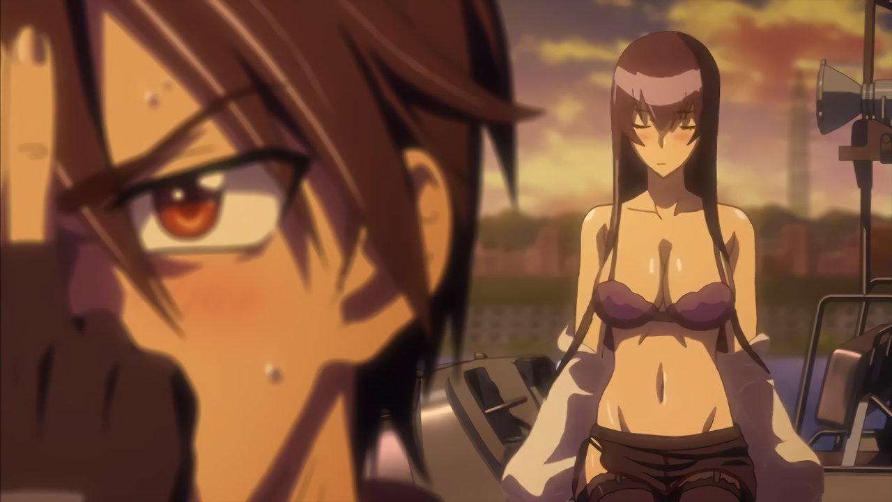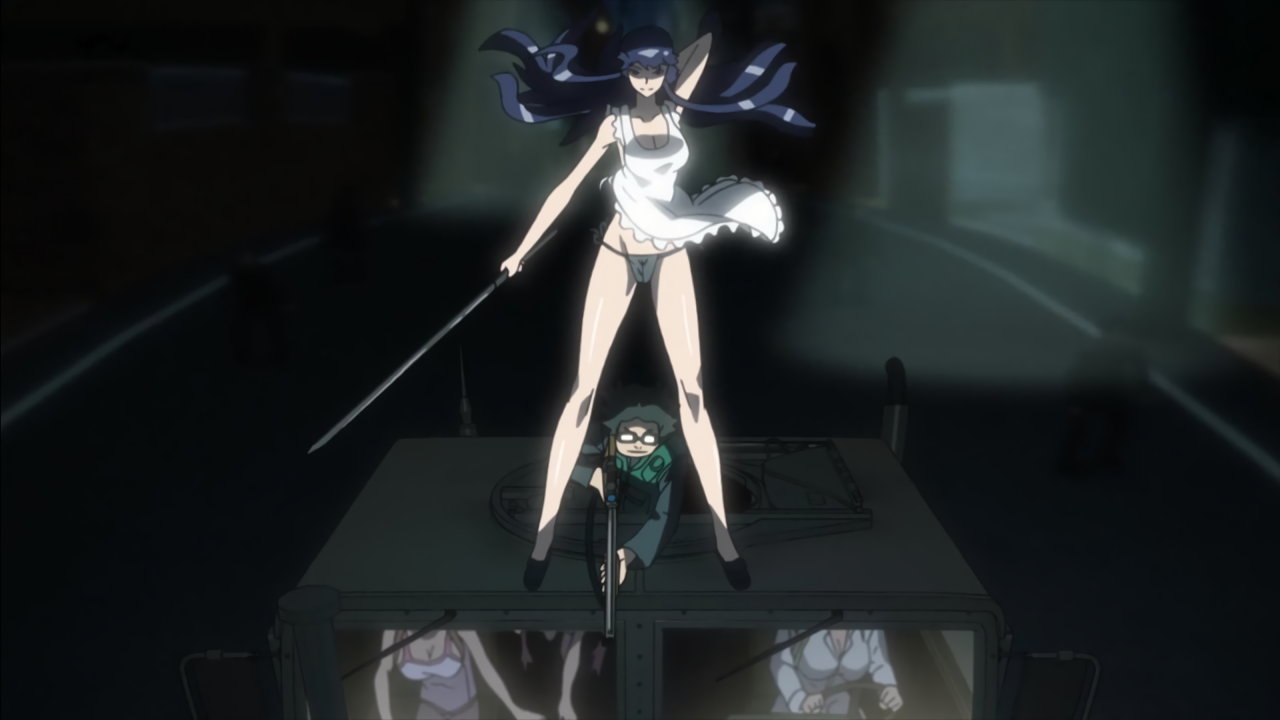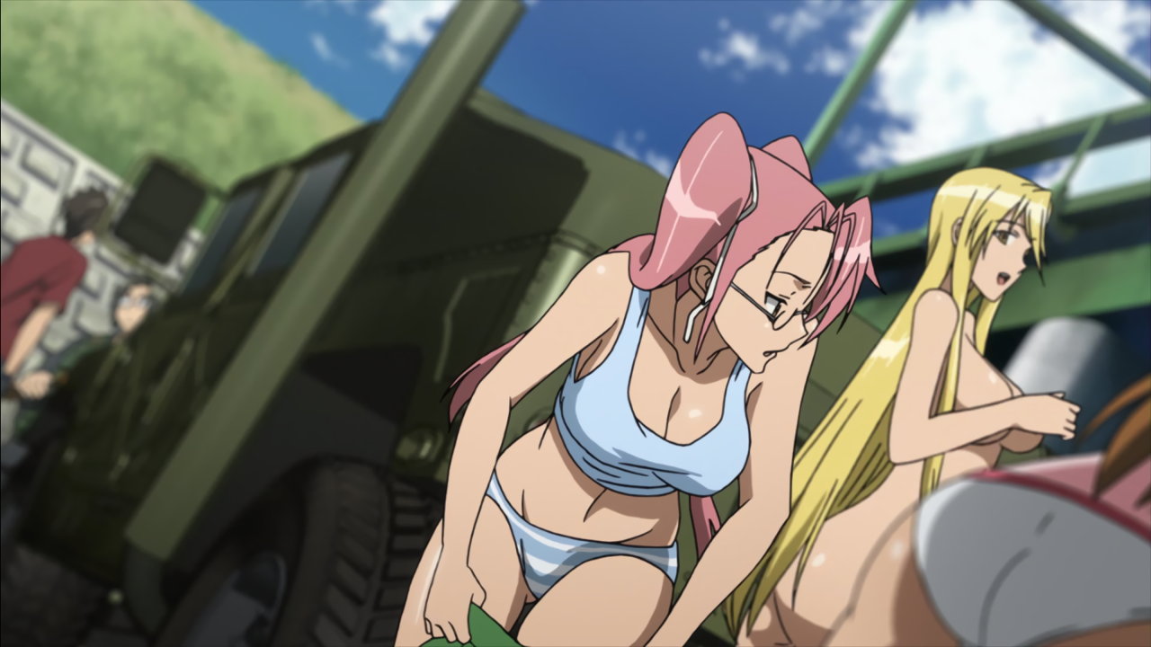 刀を持ちハンヴィーのルーフに立つ、裸エプロンの冴子のパンチラ。