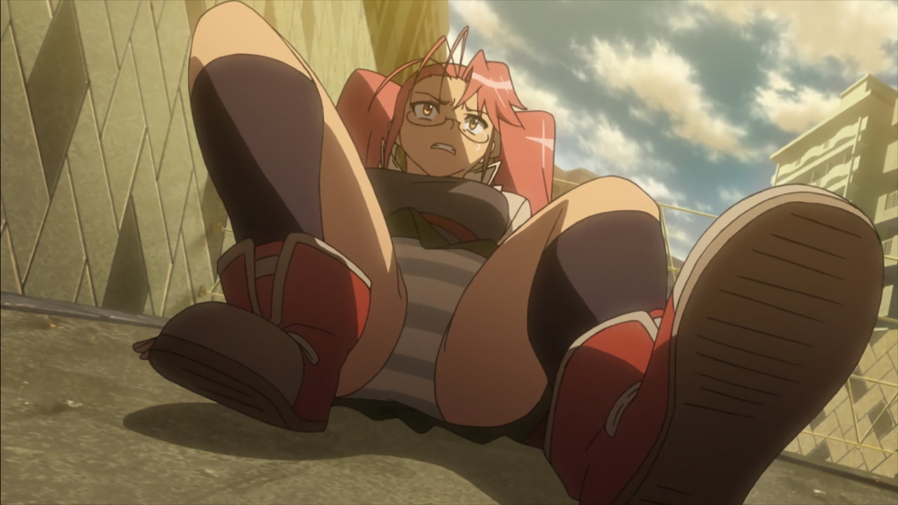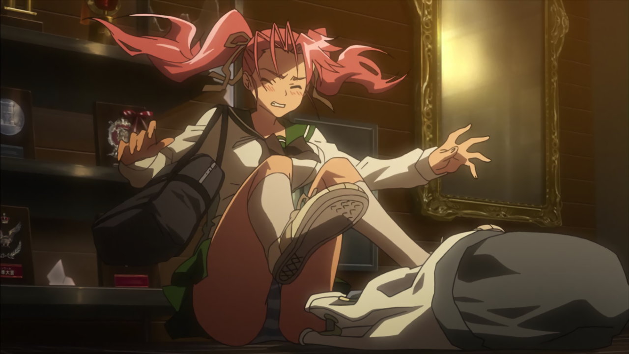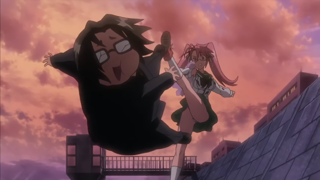 パンチラしながらコータを蹴り倒す沙耶。
