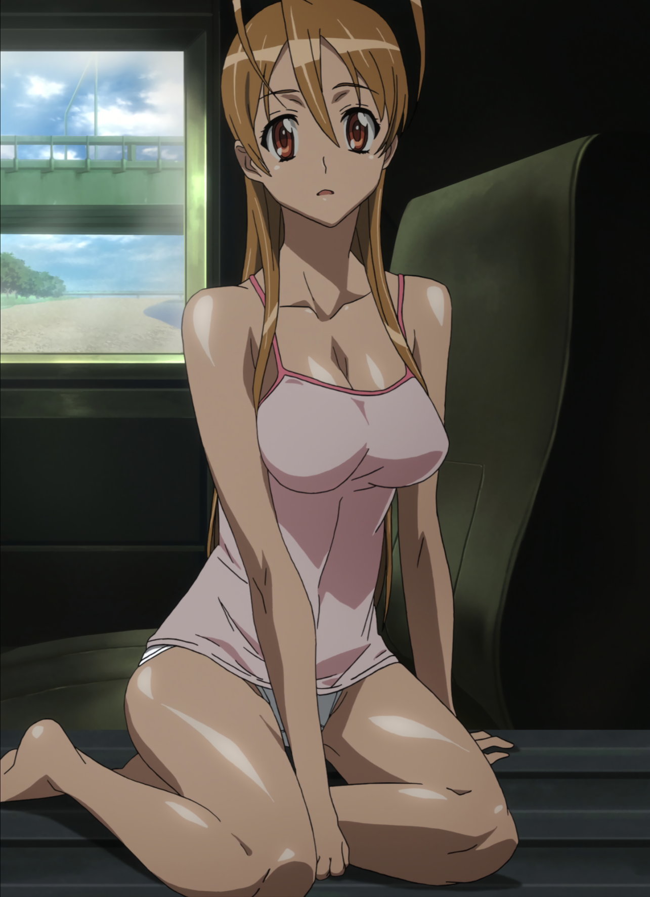 階段に座る、キャミソールにパンツの麗。
