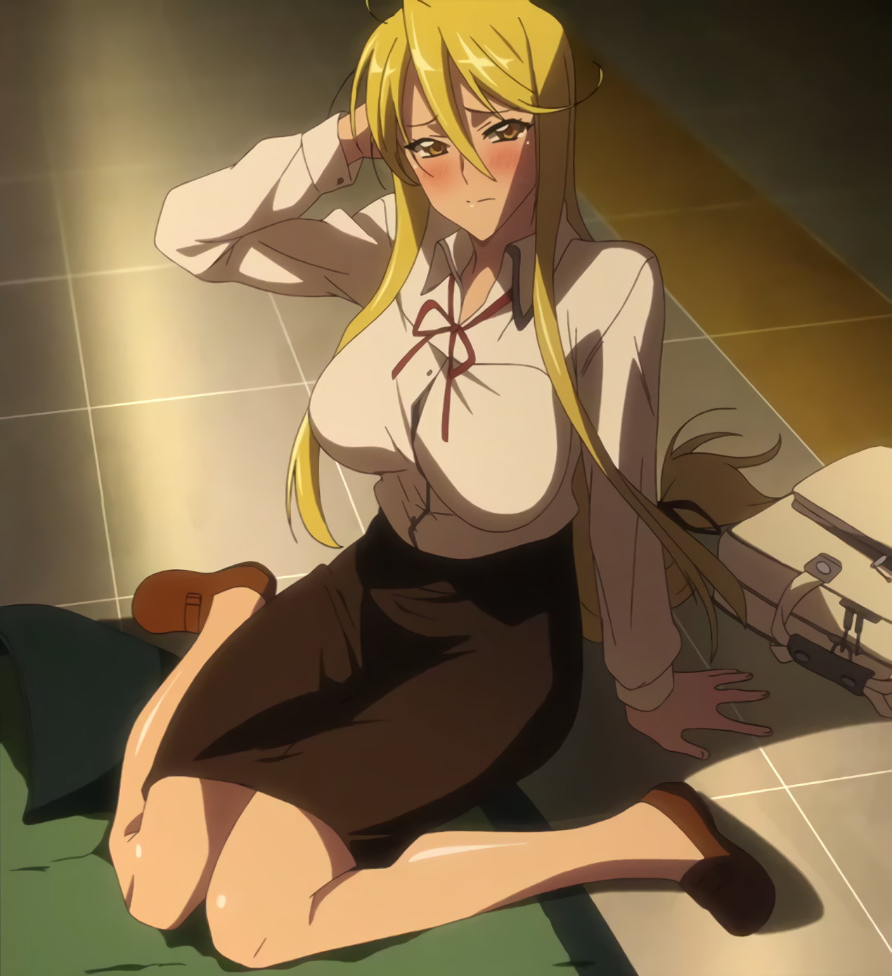転んで割座し赤面する静香。