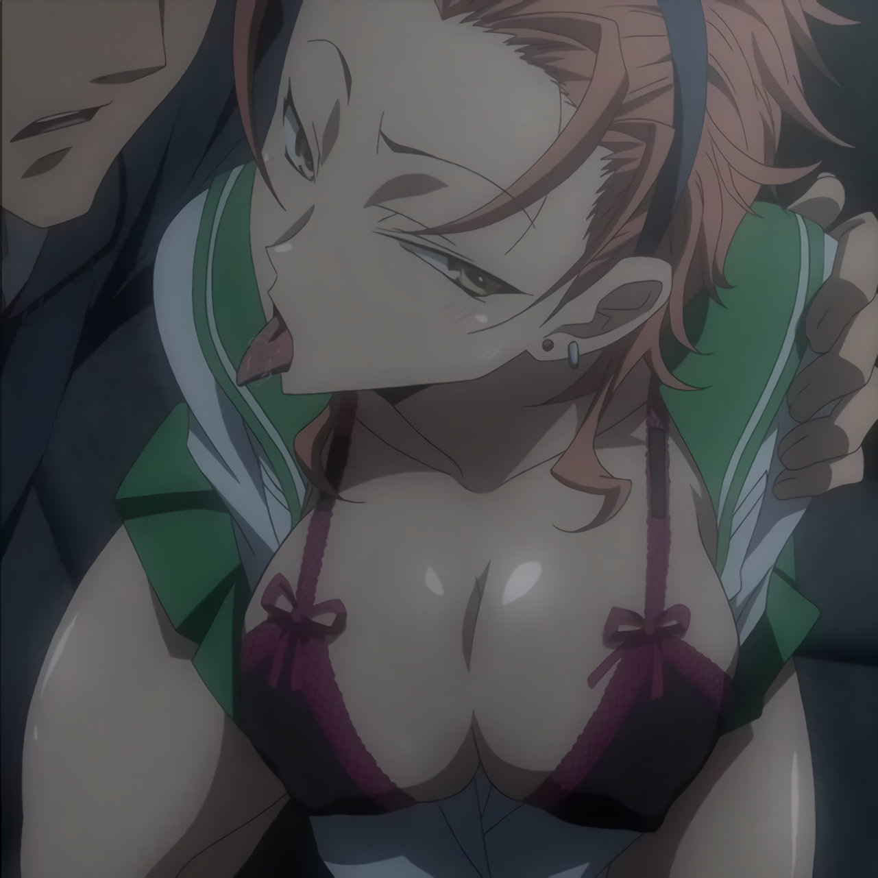 雨で制服が濡れ、透けブラしている冴子。