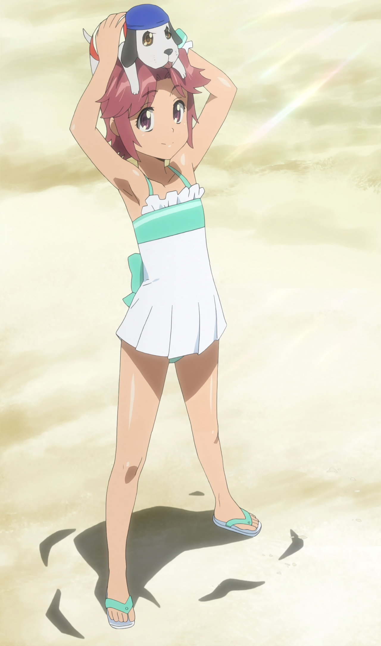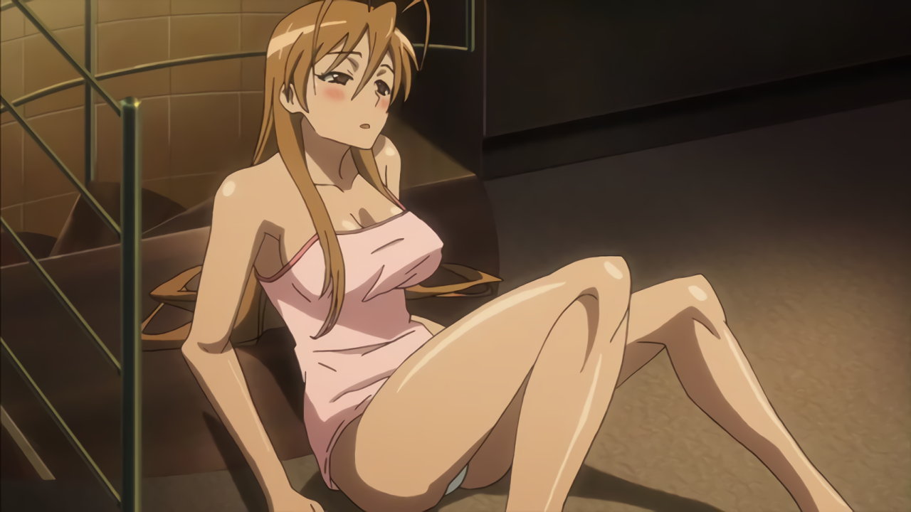酩酊して赤面している、キャミソールにパンツ姿の麗。