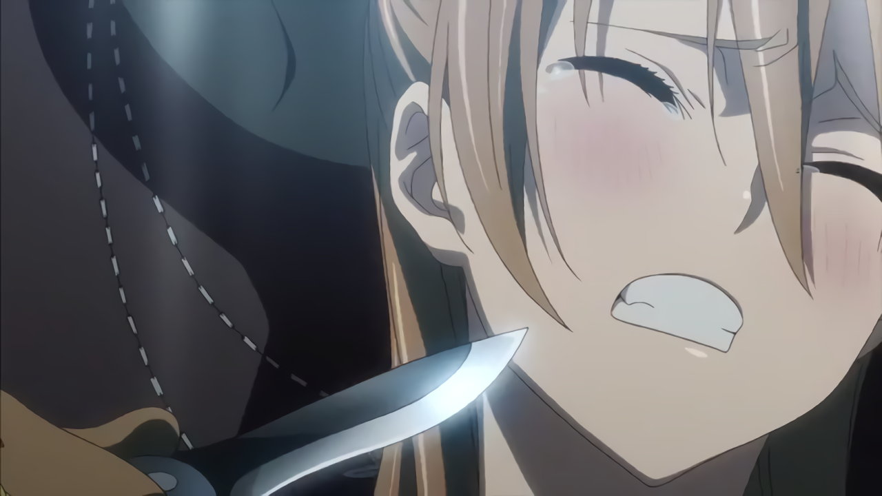 パンツ丸見えの上、ライフルのスリングにより乳房縛り状態になる麗。