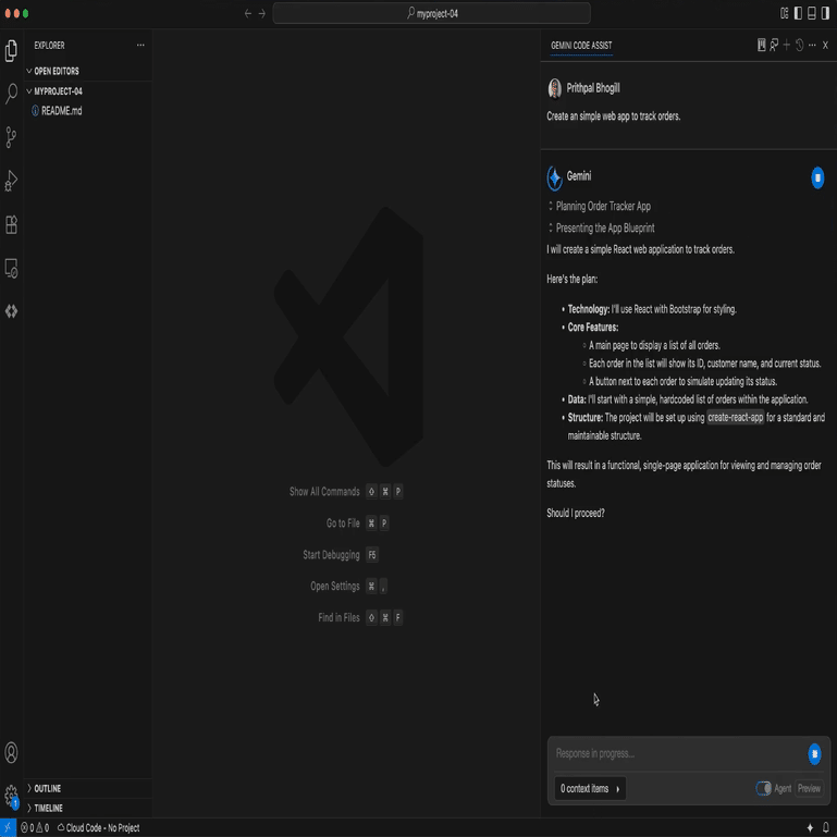 「Gemini Code Assist」は、「Gemini CLI」と同じテクノロジーを採用しました。「VS Code」では、エージェントモードを使用してチャットウィンドウに任意のプロンプトを配置でき、「Code Assist」がテストの作成、エラーの修正、機能のビルド、さらにはコードの移行まで、ユーザーに代わってひたすら作業します。プロンプトに基づいて、「Code Assist」のエージェントは複数ステップのプランを作成し、失敗した実装パスから自動的に回復し、ユーザーが想像もしなかったような解決策を提案します。