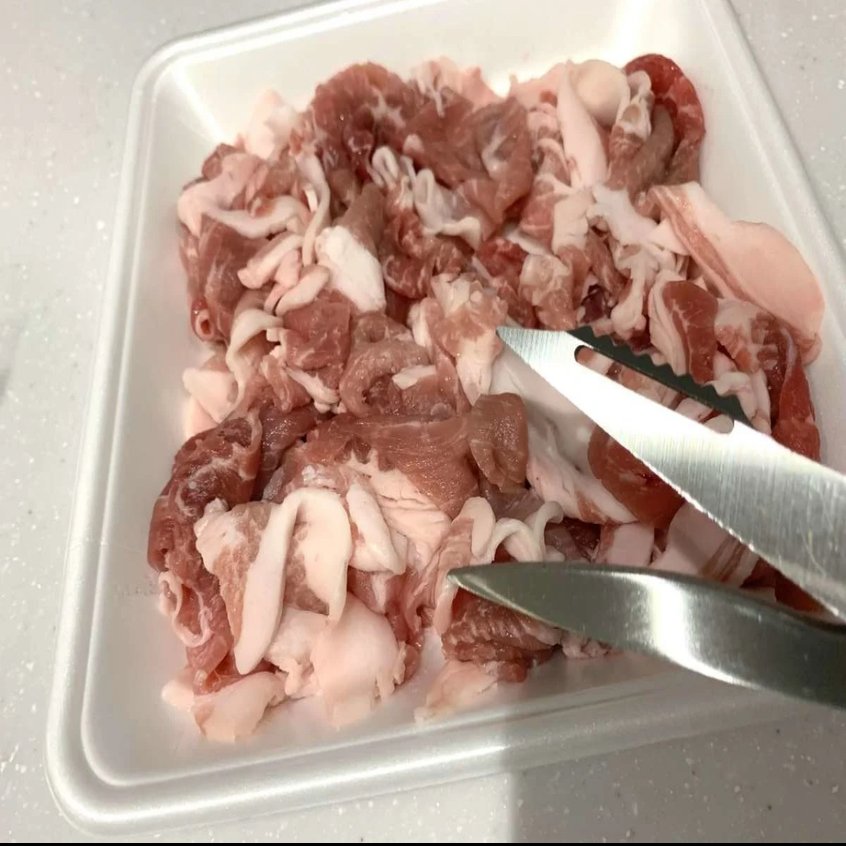 豚こま切れ肉をキッチンばさみで、細かく切ります。キッチンばさみがない場合は、包丁で細かく切りましょう。