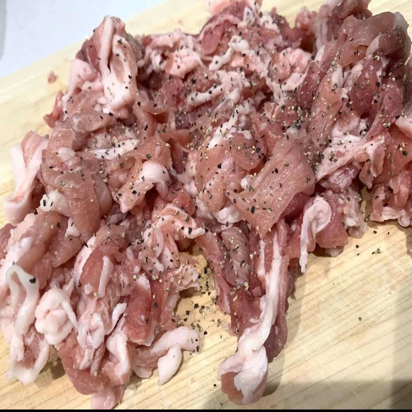 切った豚こま切れ肉に塩・粗挽き黒こしょうで下味をつけます。