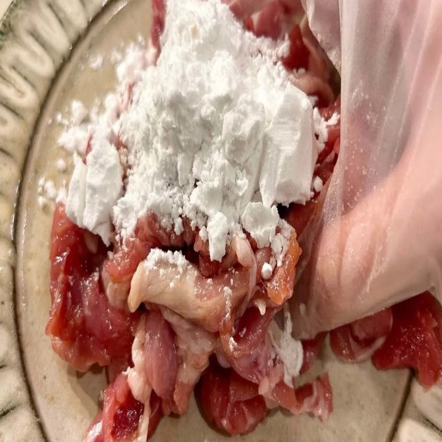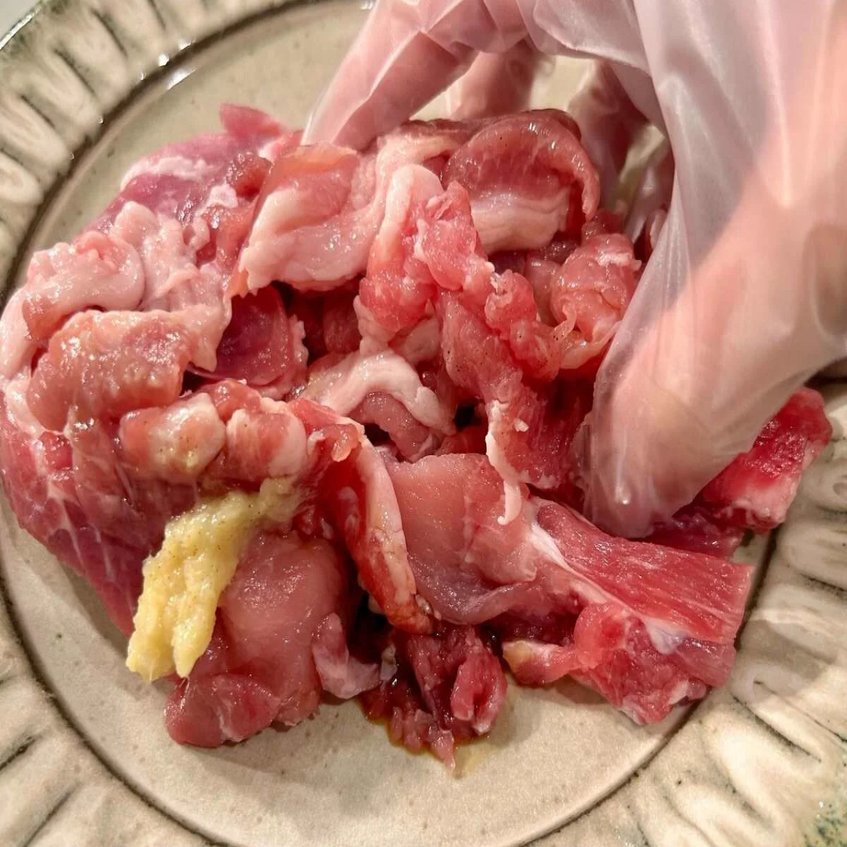 豚こま切れ肉に調味料をもみ込んで下味をつけます。