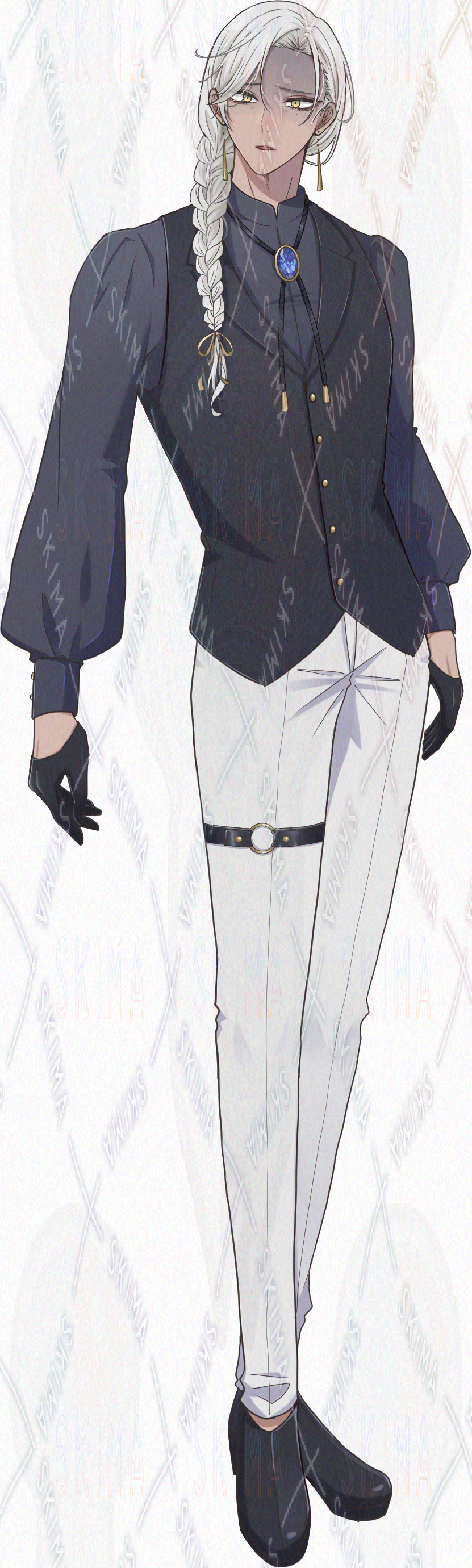 銀髪 白髪 金目 黄色目 褐色肌 三つ編み ピアス ハーフグローブ スーツ ゴシック アラビアン TRPG 立ち絵 全身 ゲーム