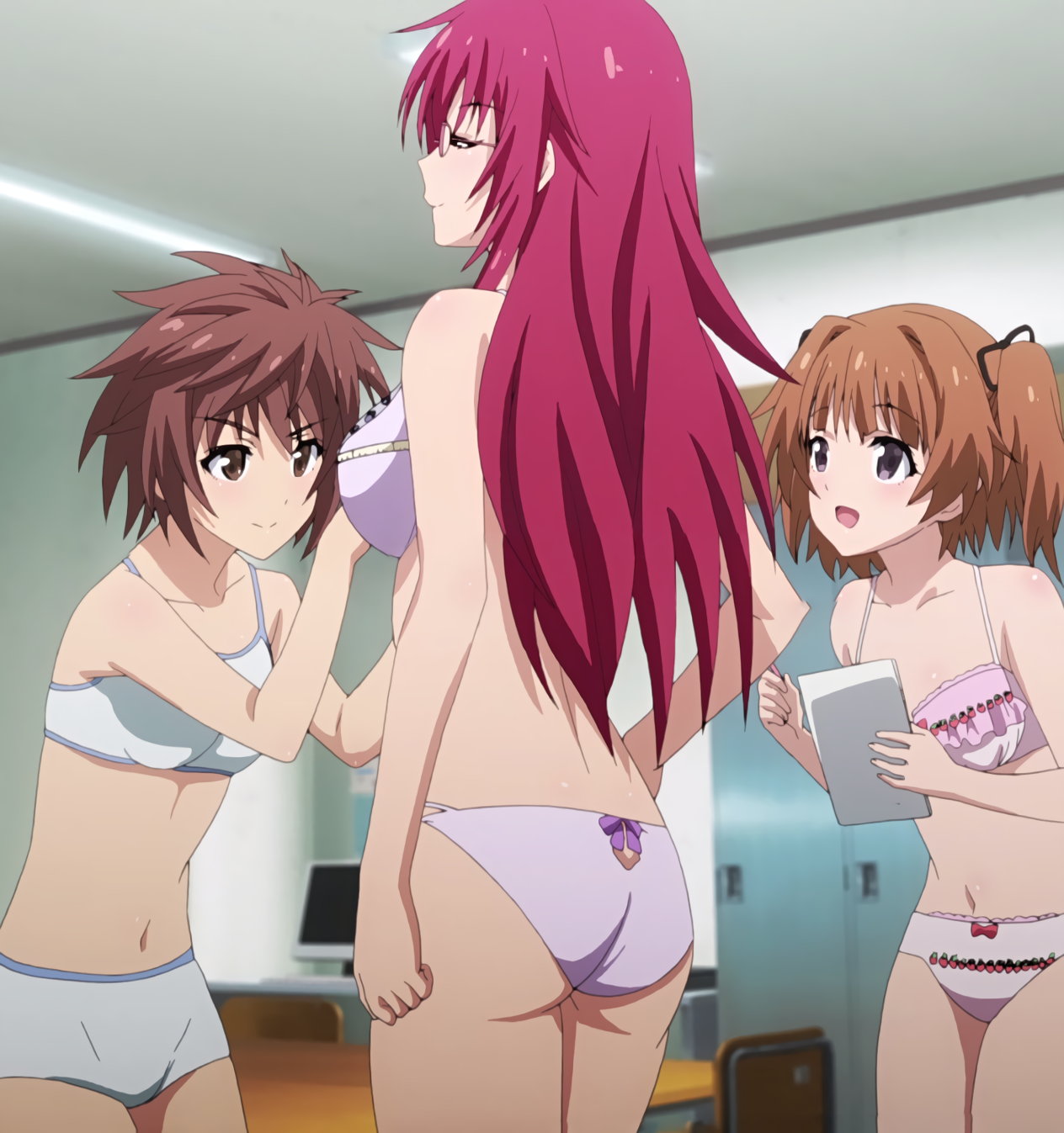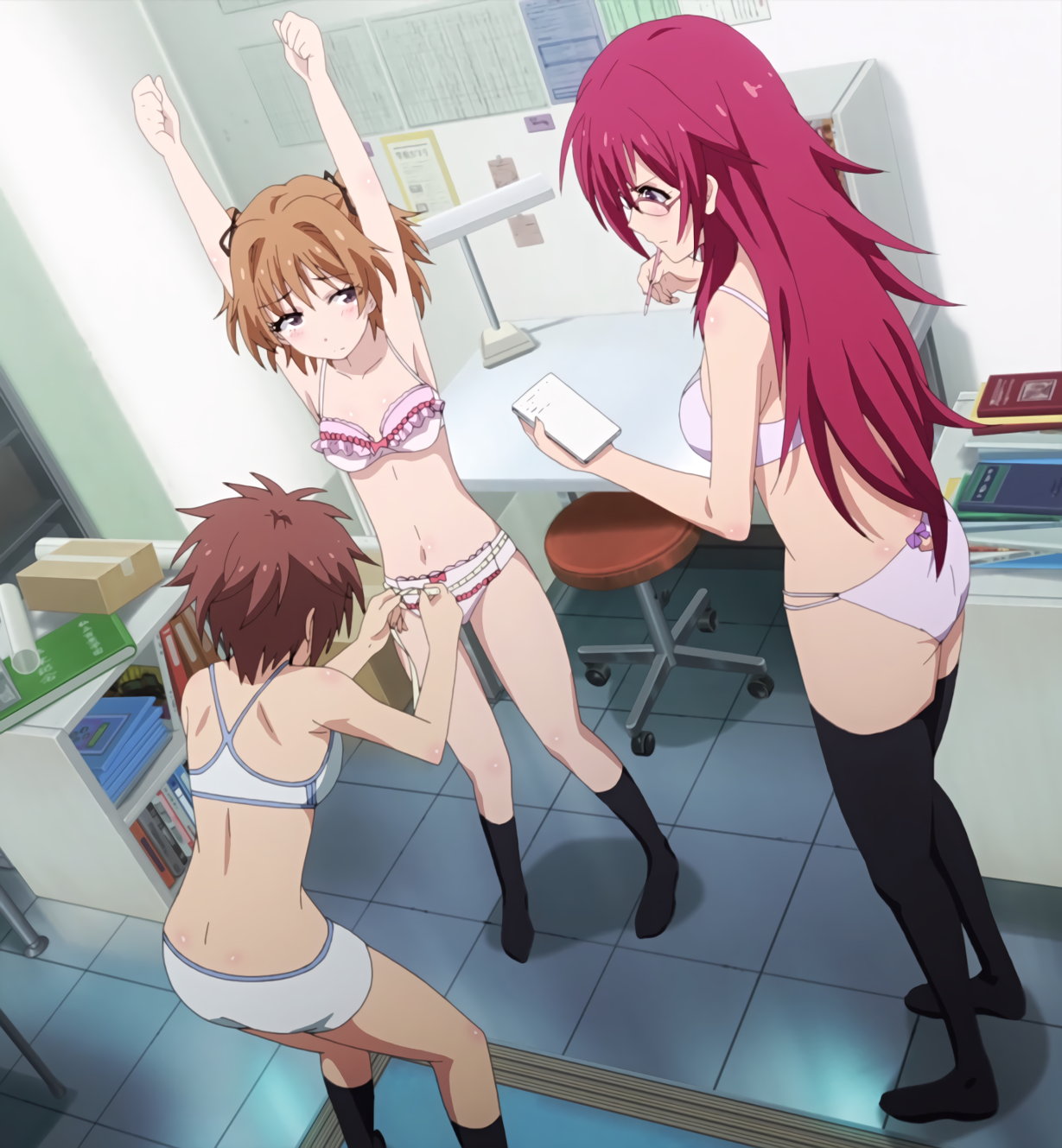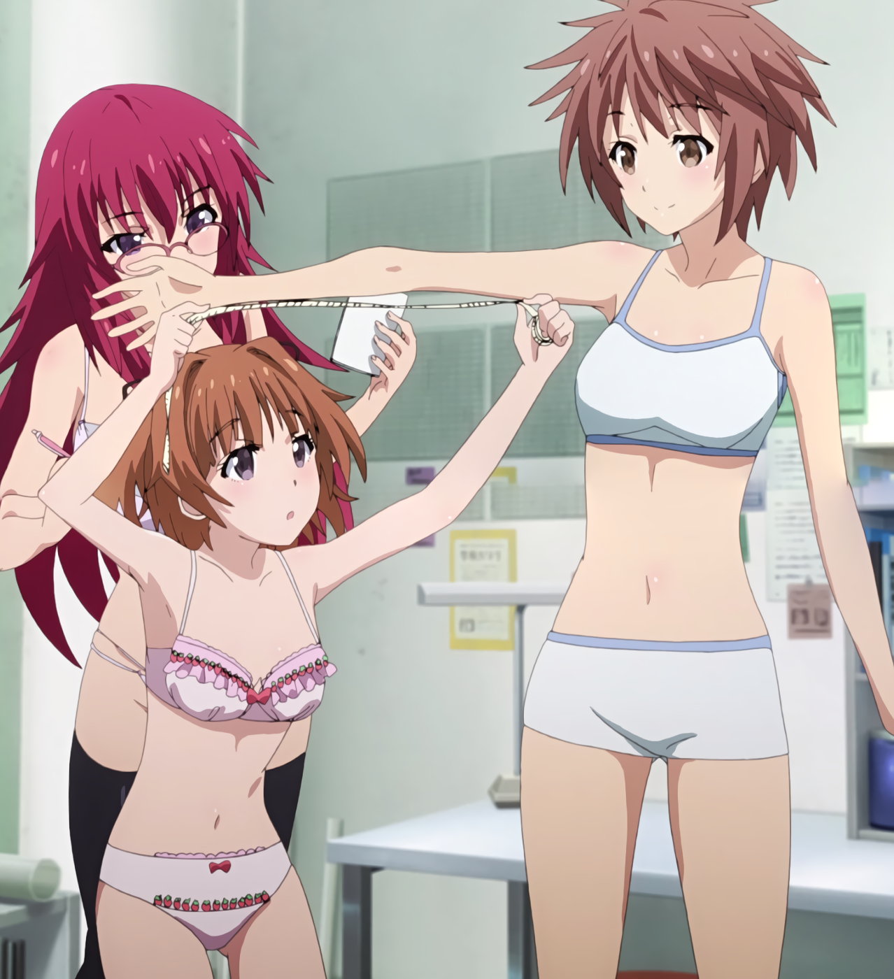 下着姿で身体測定中のテルハ、夕夏、うぐいす、砂雪。
