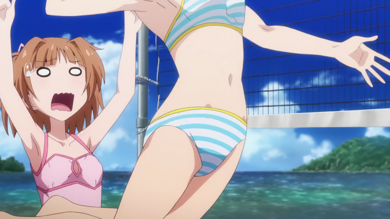 ビーチバレーをする水着ヒロインたち。