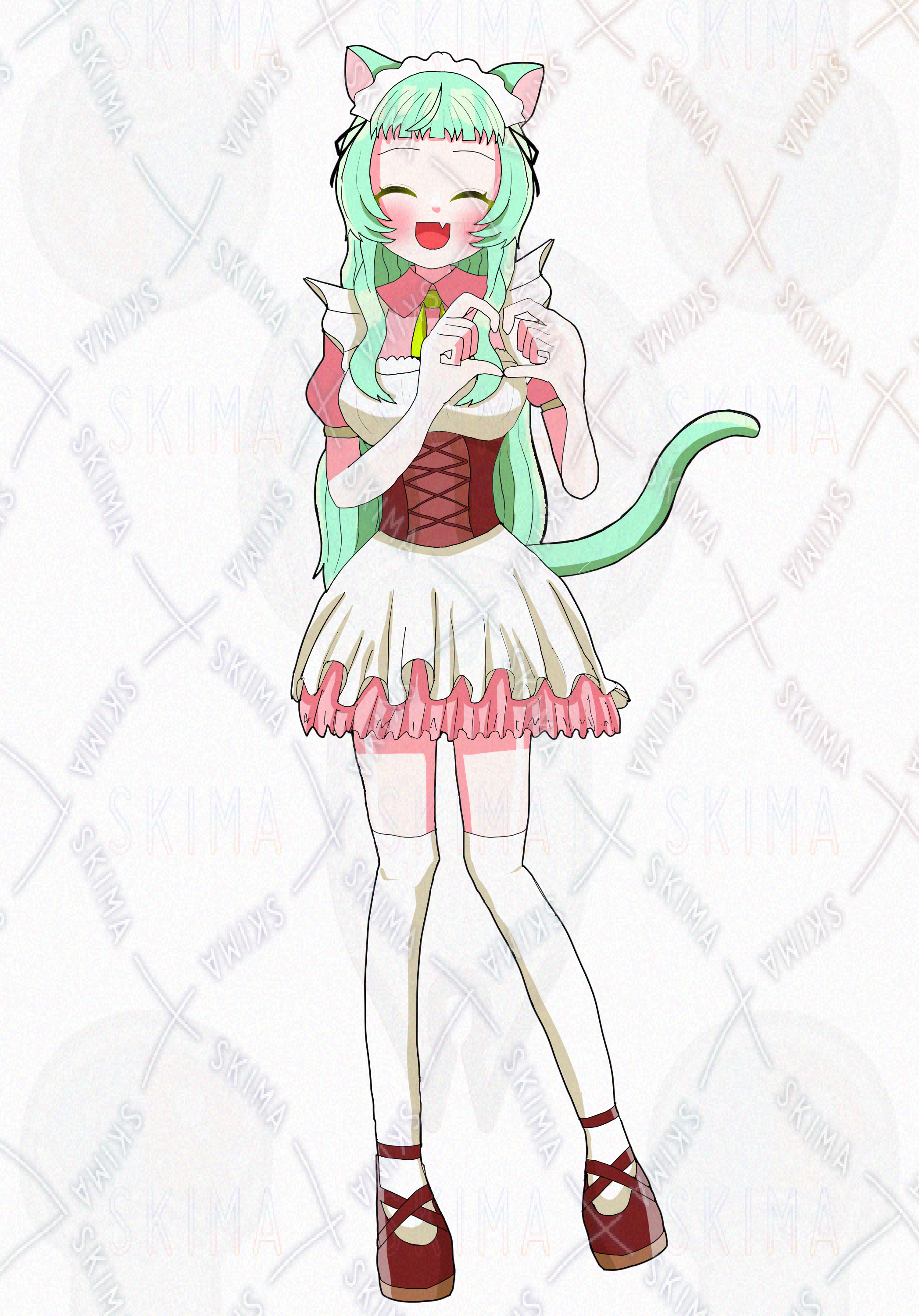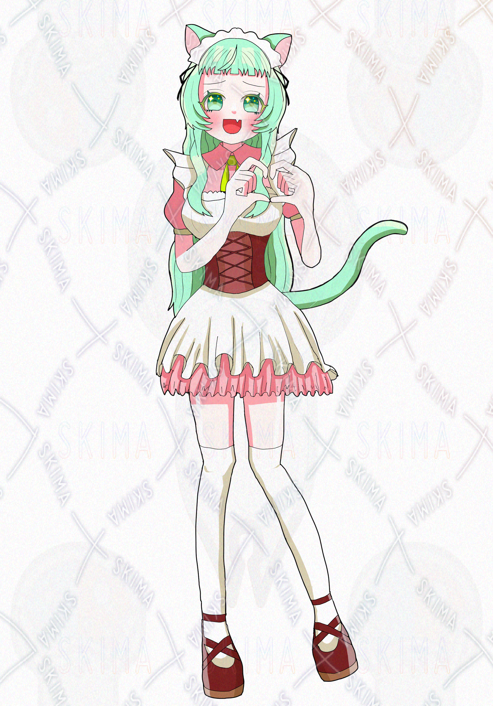 女の子、ミントグリーン、緑髪、猫耳、メイド服、ゆめかわ、かわいい、ハイソックス、絶対領域、フリル