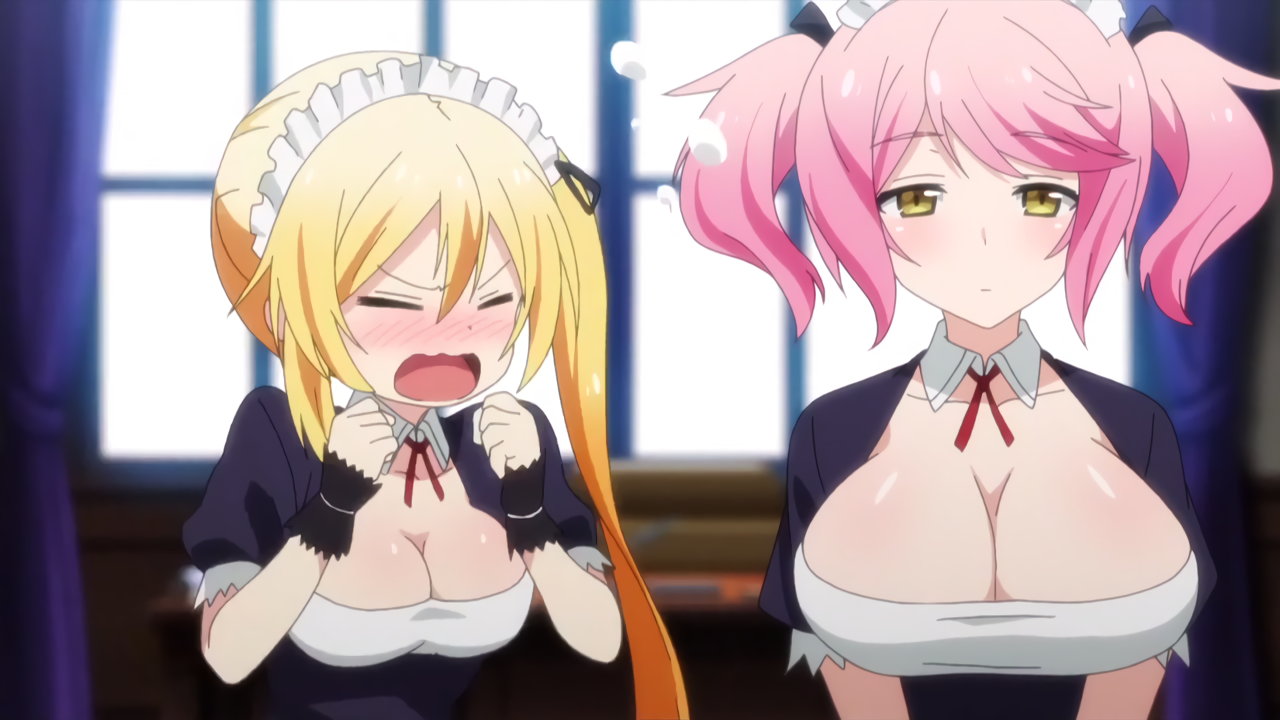 ティルファーの考案により、胸谷間全開のエロメイド服を着てルクスを接待する、リーシャとフィルフィ―。