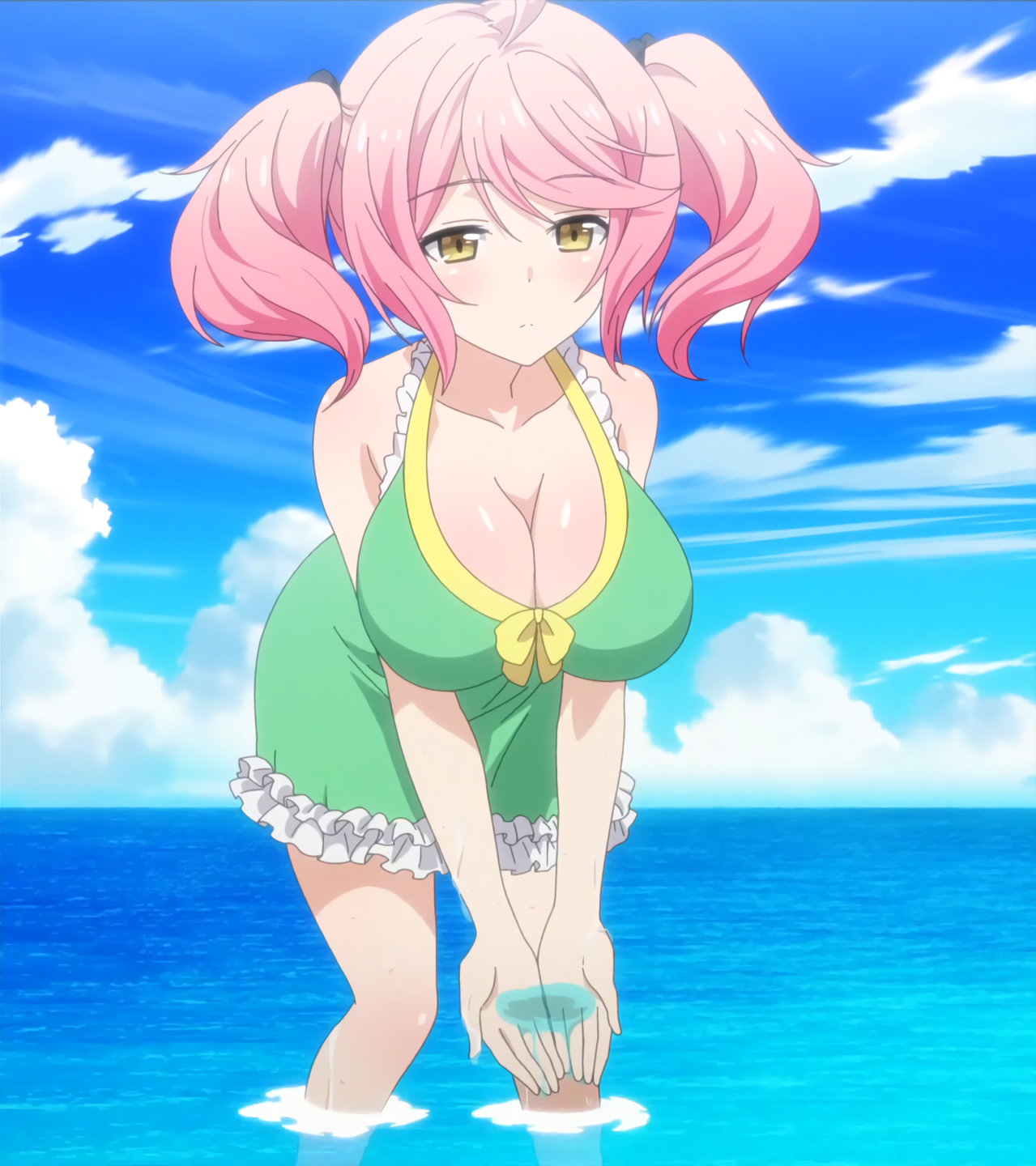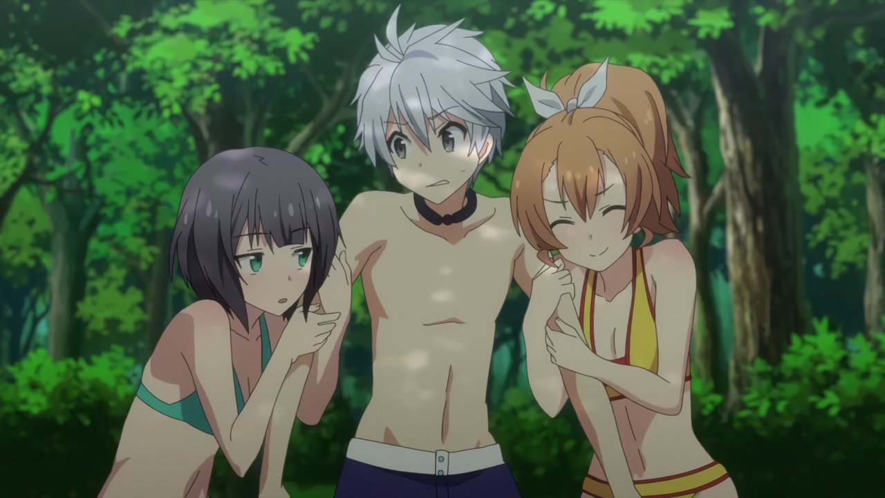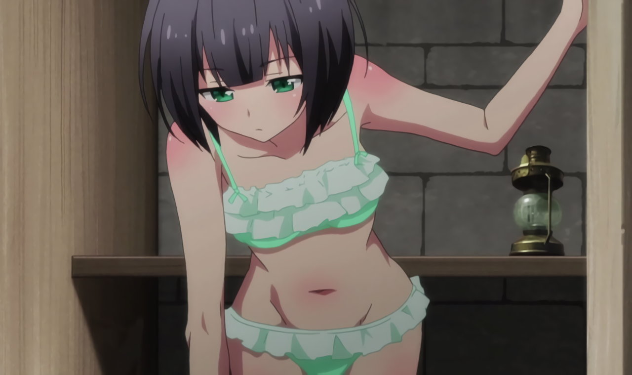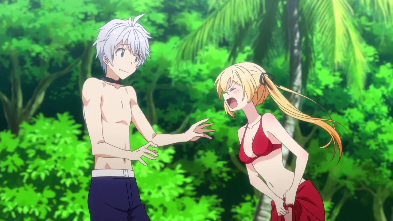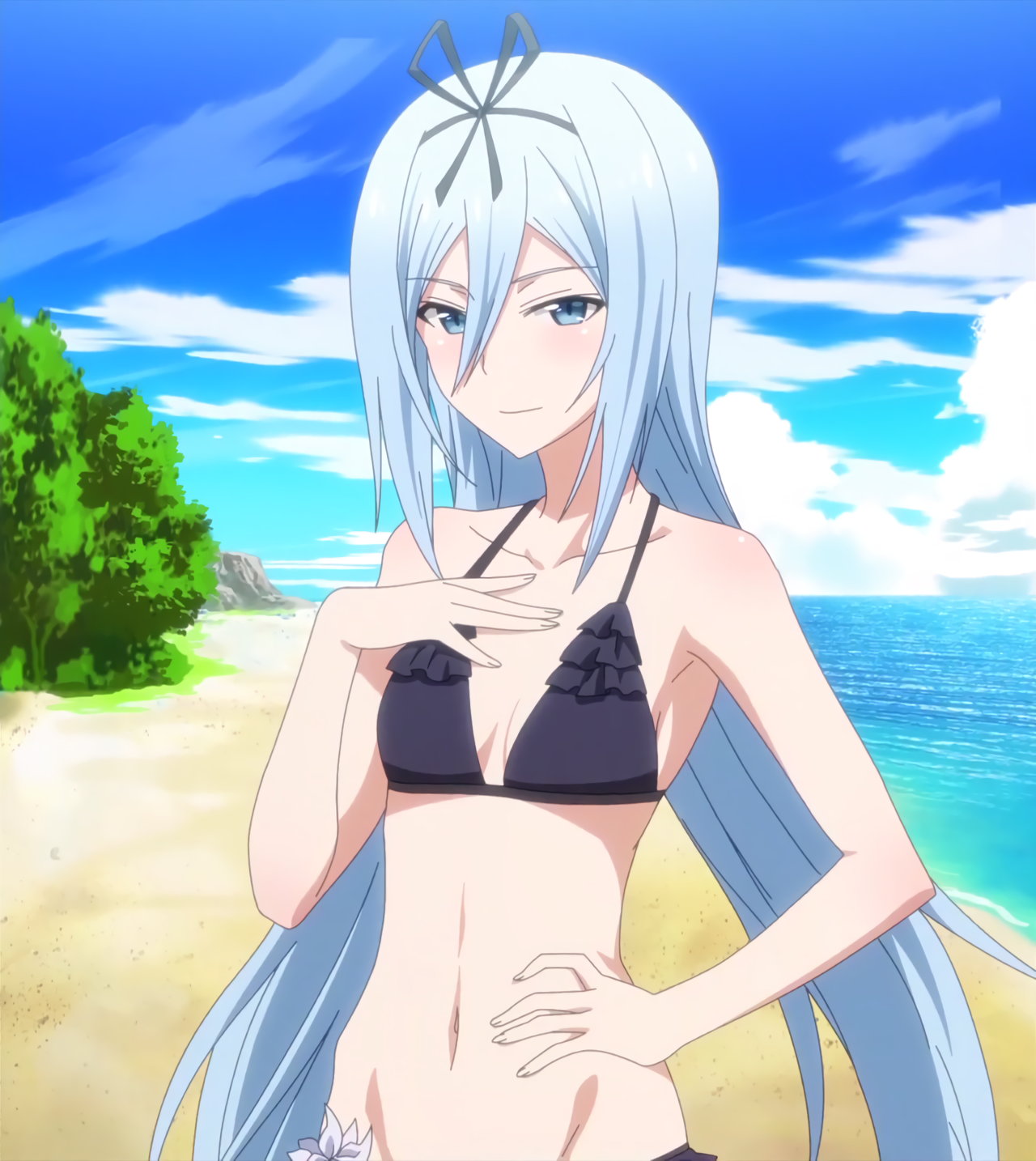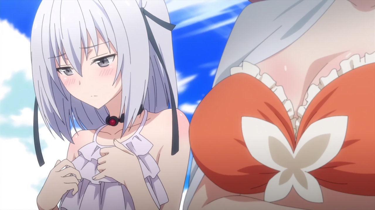 ローライズビキニ水着姿を恥ずかしがるリーシャ。