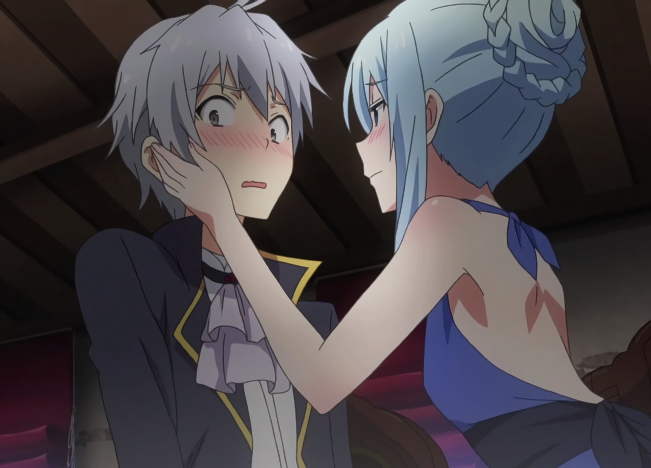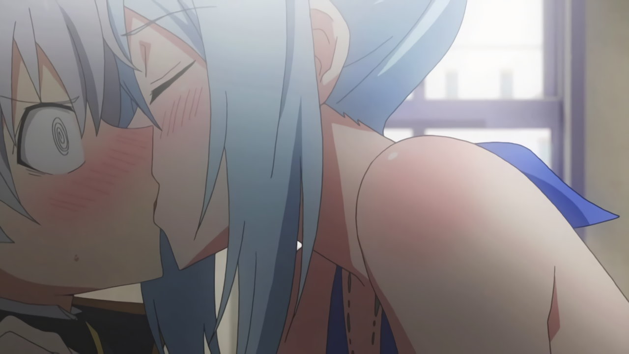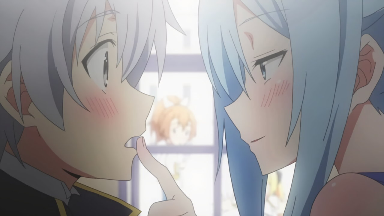 デート中、ルクスにキスをするクルルシファー。その様子を窓の外から観察する、リーシャとティルファー。