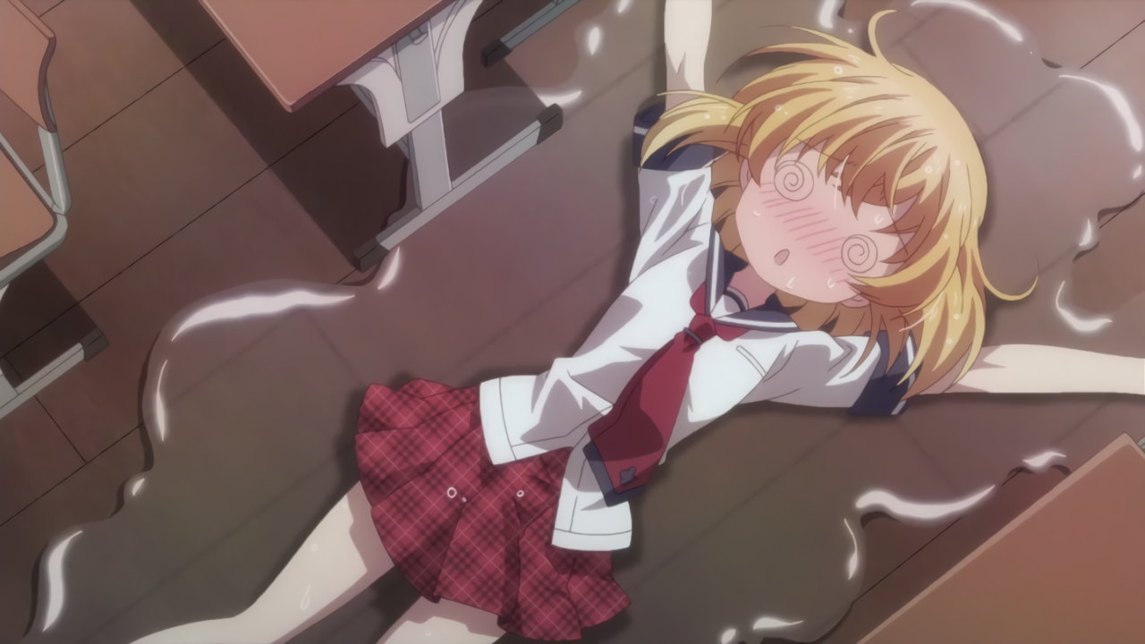 赤面し目を回して倒れる、制服ずぶ濡れの杏。