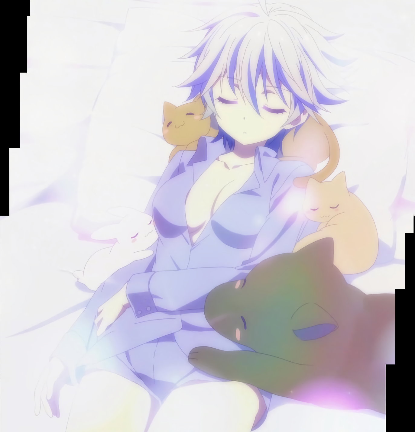 猫に囲まれて眠る、胸谷間チラ・ワイシャツ短パン姿の蓮。