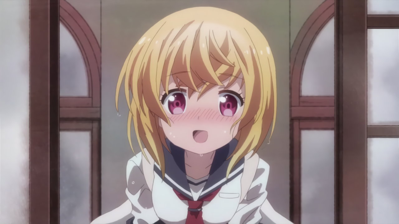 赤面し喘ぎながら教室の戸を開ける、制服ずぶ濡れの杏。