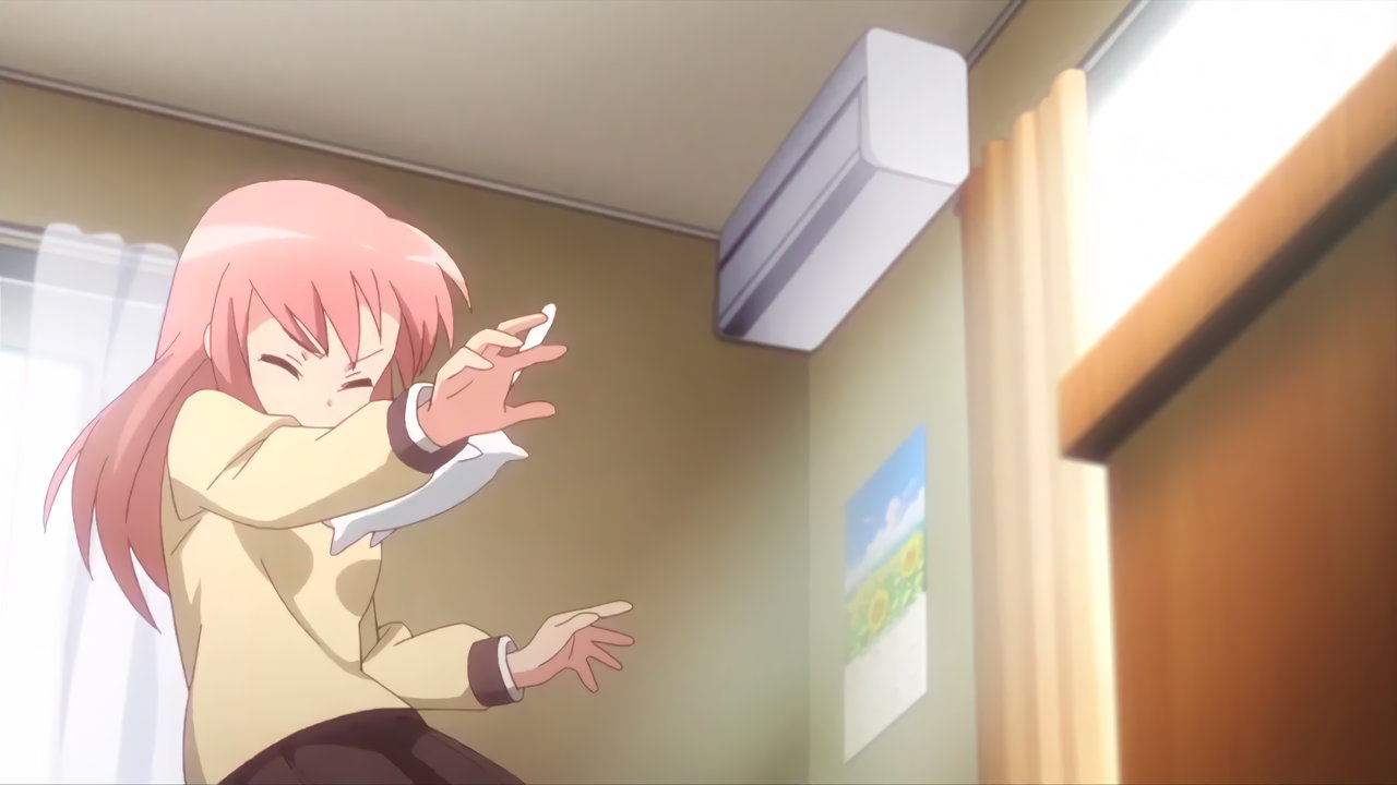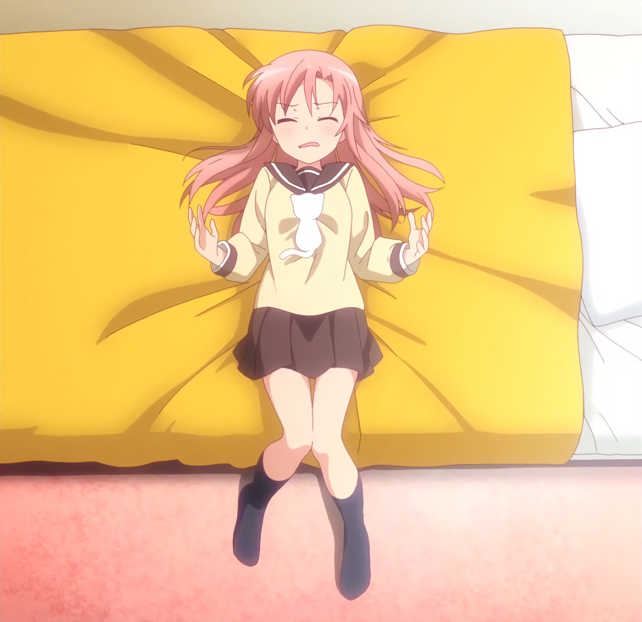 猫に飛び付かれ、ベッドに押し倒される芹奈。
