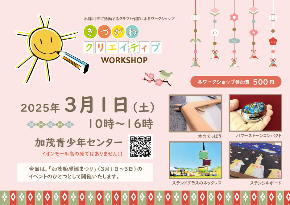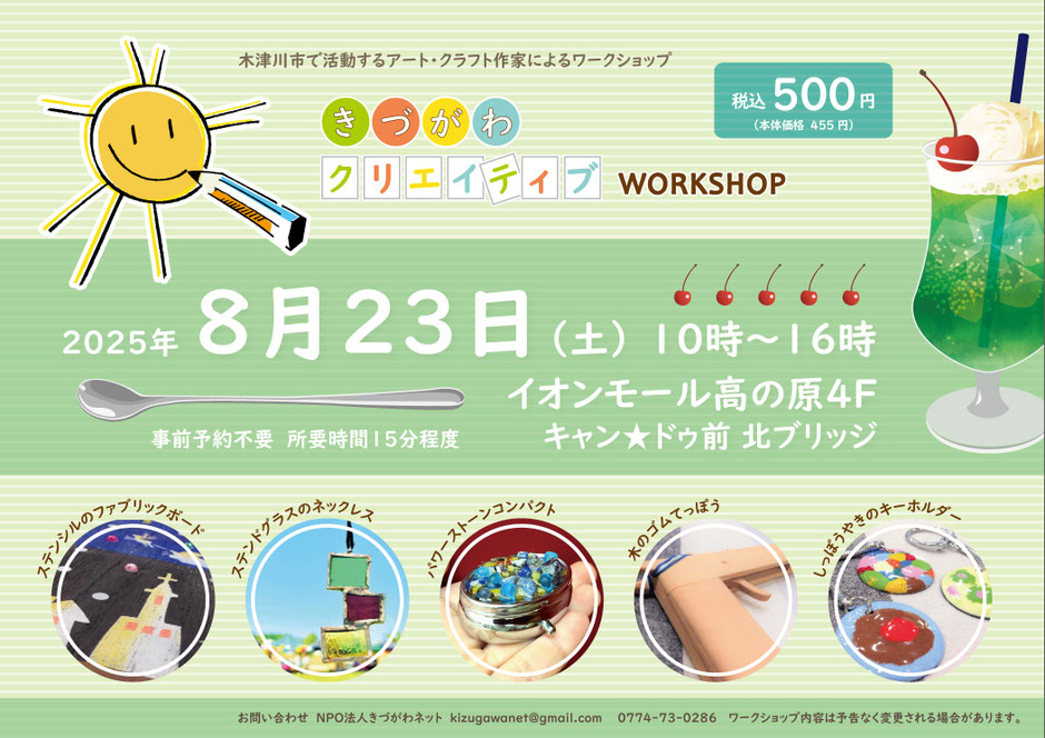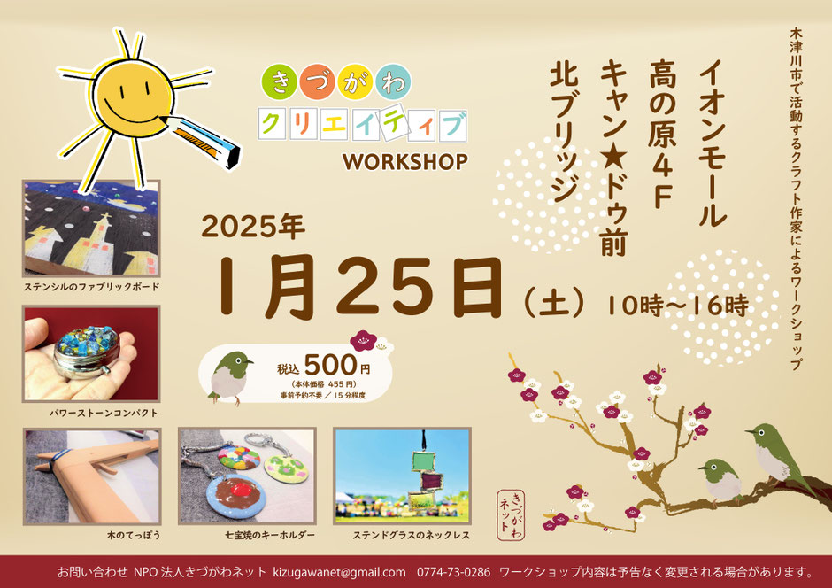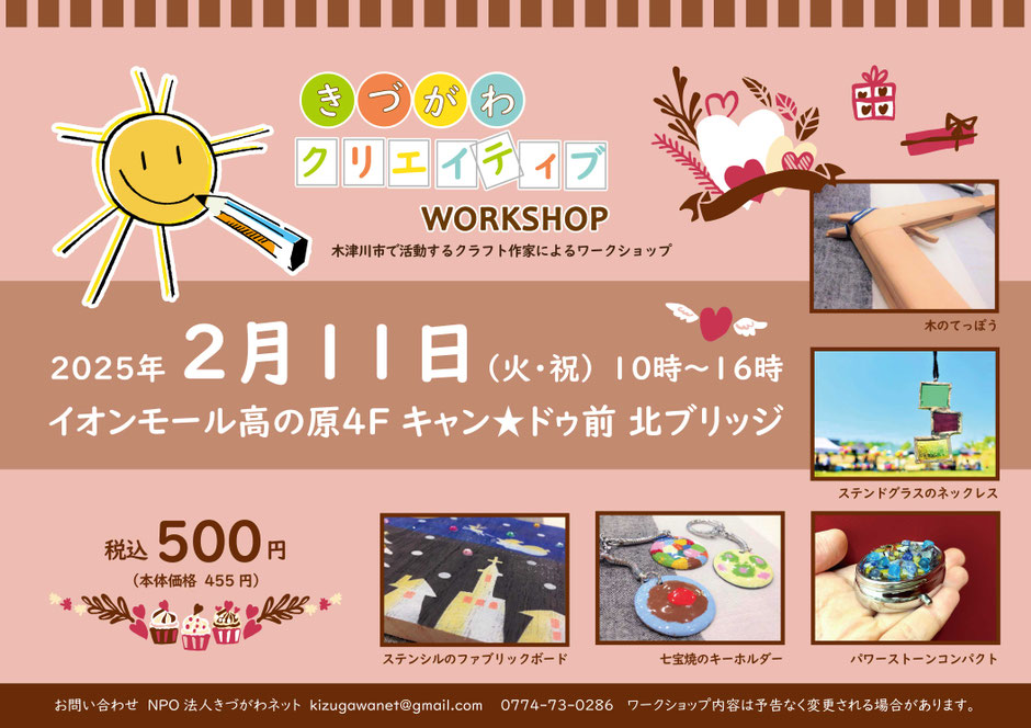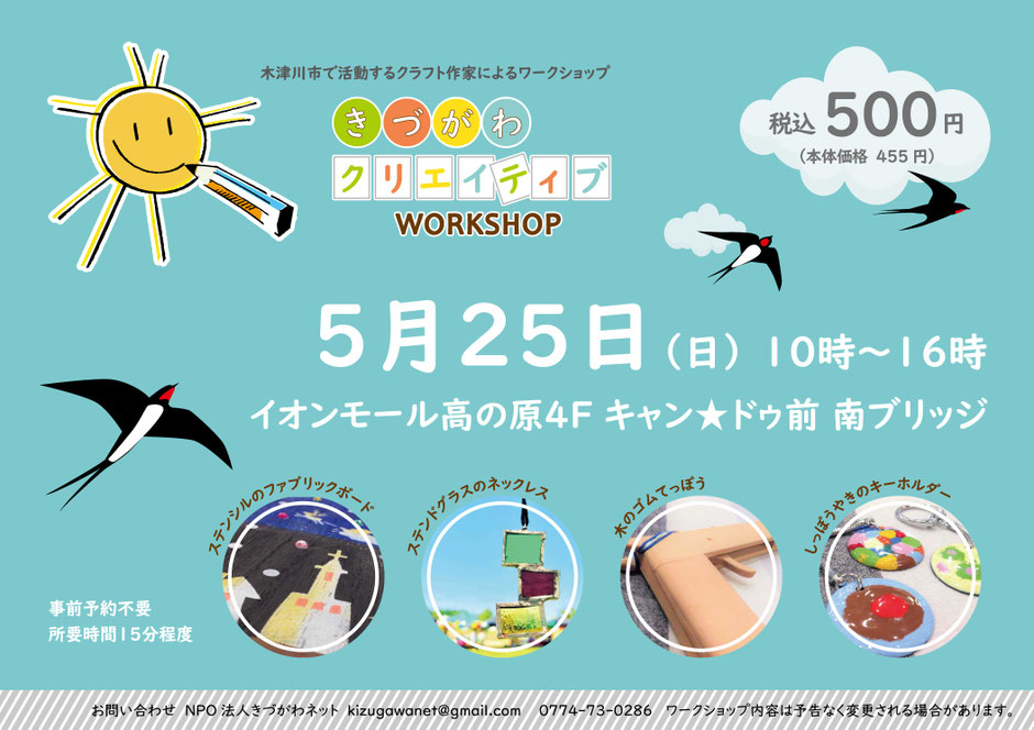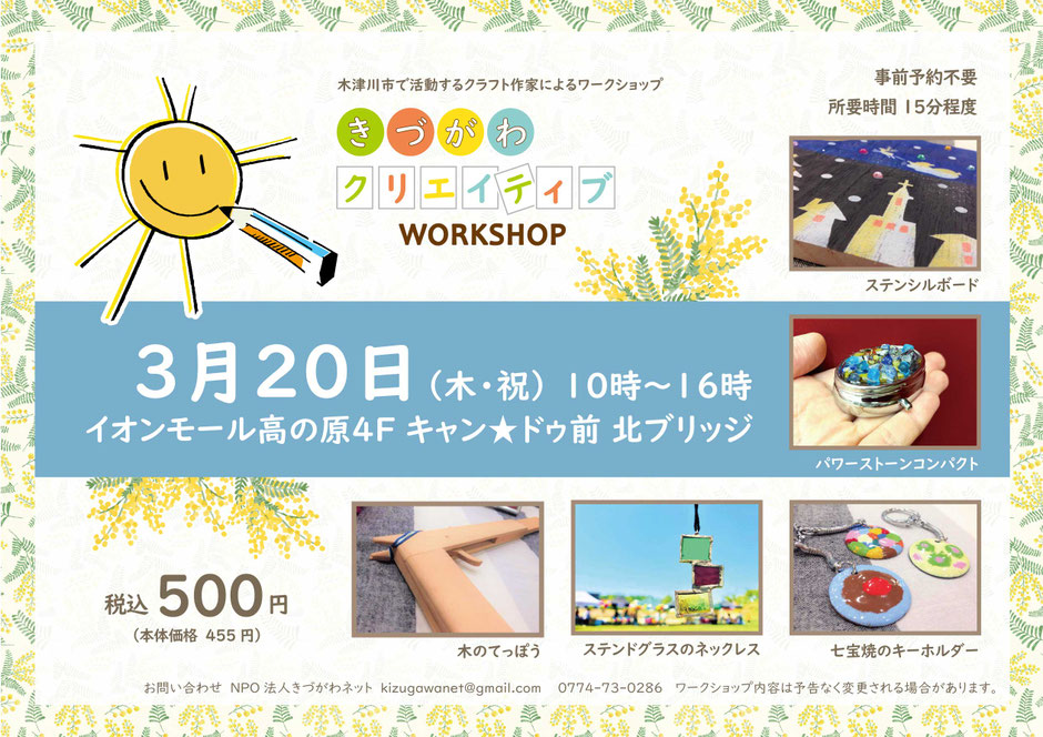 木津川市で活動するアートクラフト作家による予約不要、500円のワークショップです。