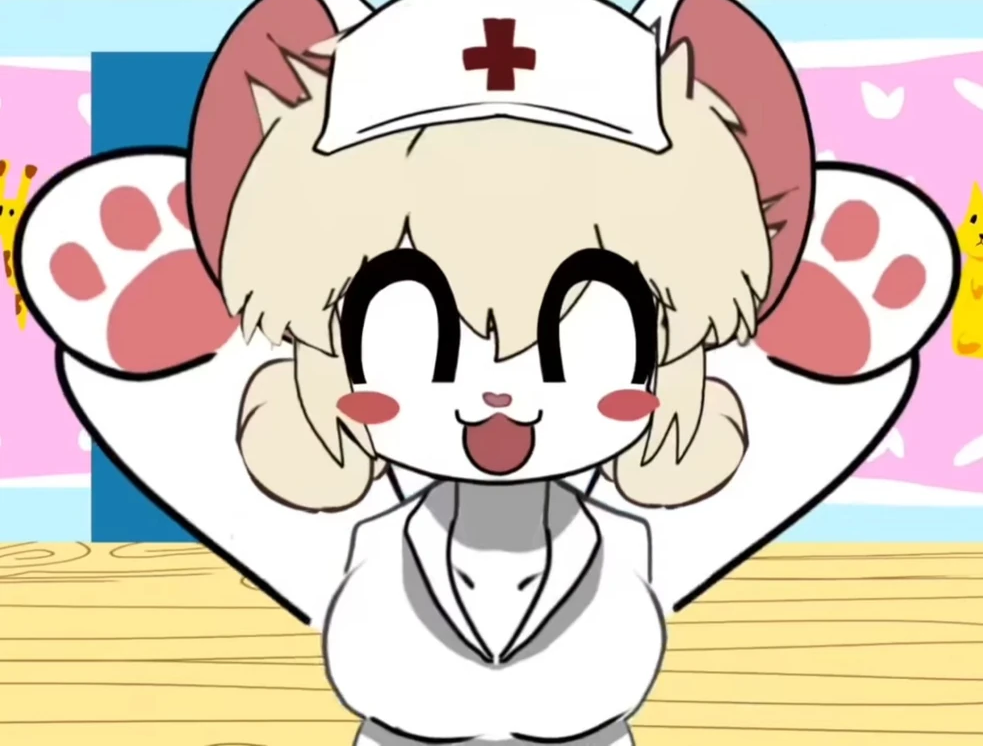 She wears a short doctor's gown and a nurse's hat with a dark red plus symbol in the middle. |