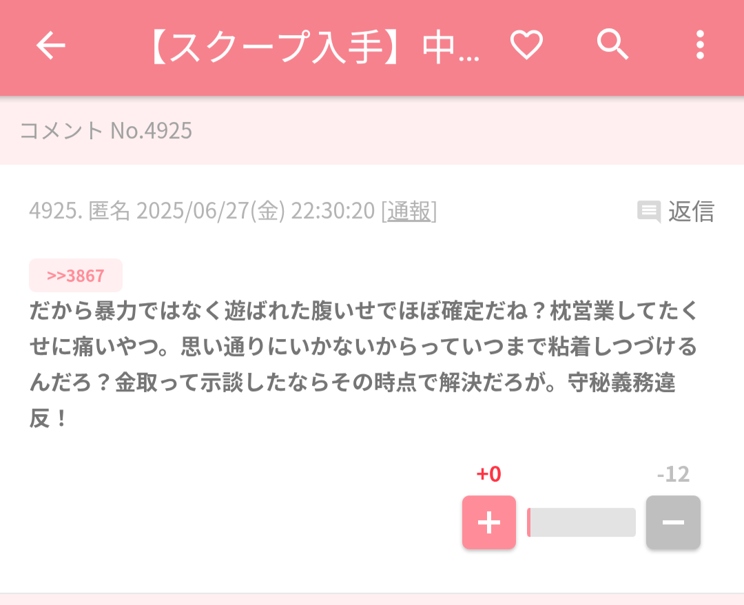 だから暴力ではなく遊ばれた腹いせでほぼ確定だね?枕営業してたくせに痛いやつ。思い通りにいかないからっていつまで粘着しつづけるんだろ?金取って示談したならその時点で解決だろが。守秘義務違反!+10
