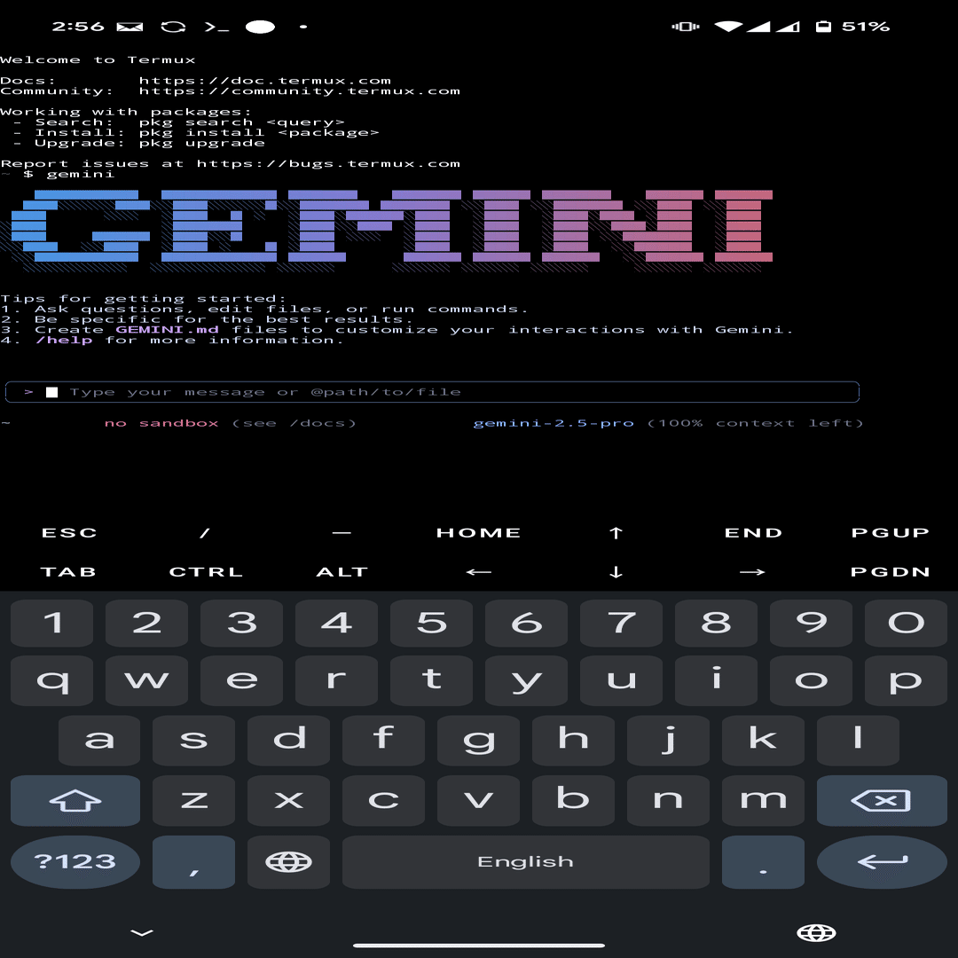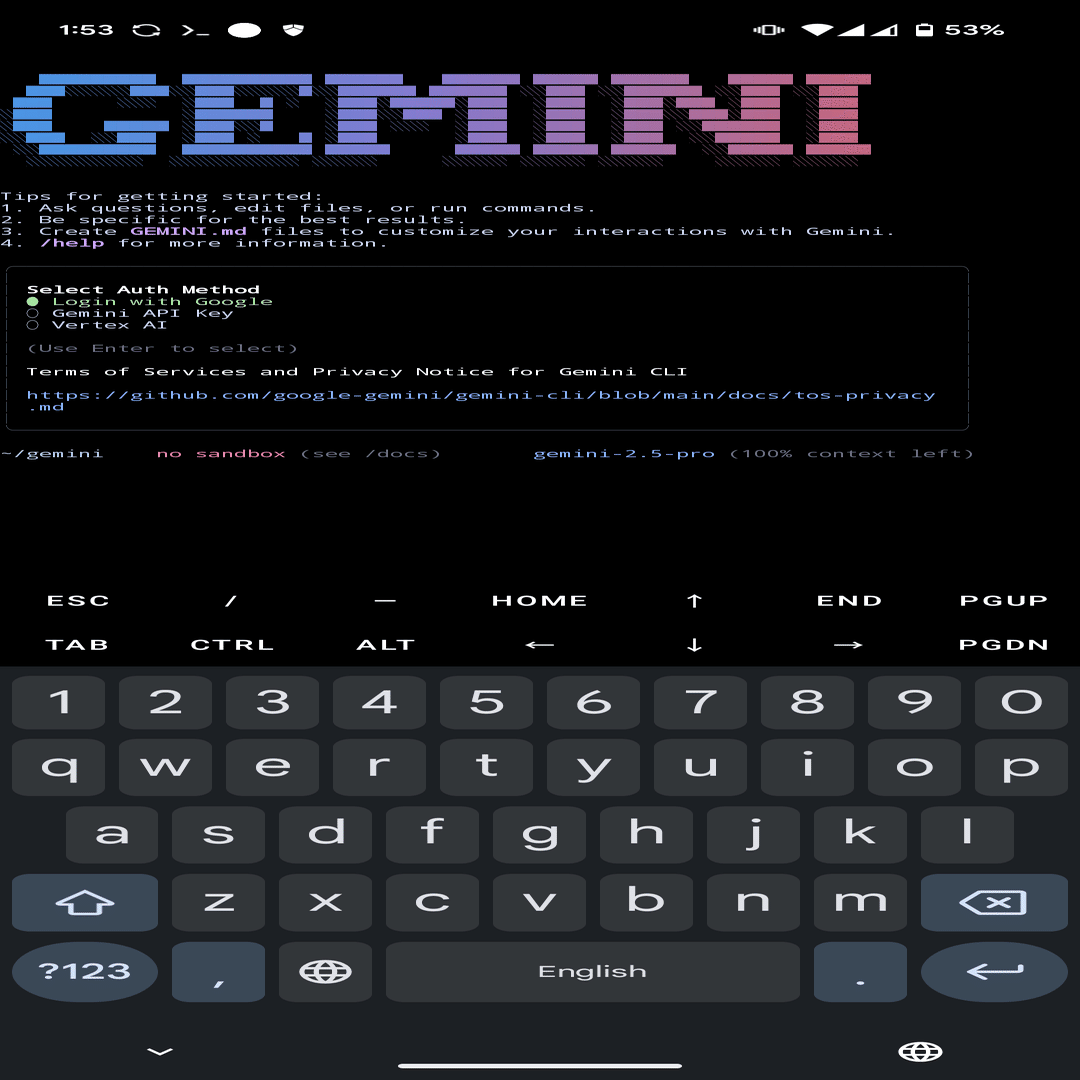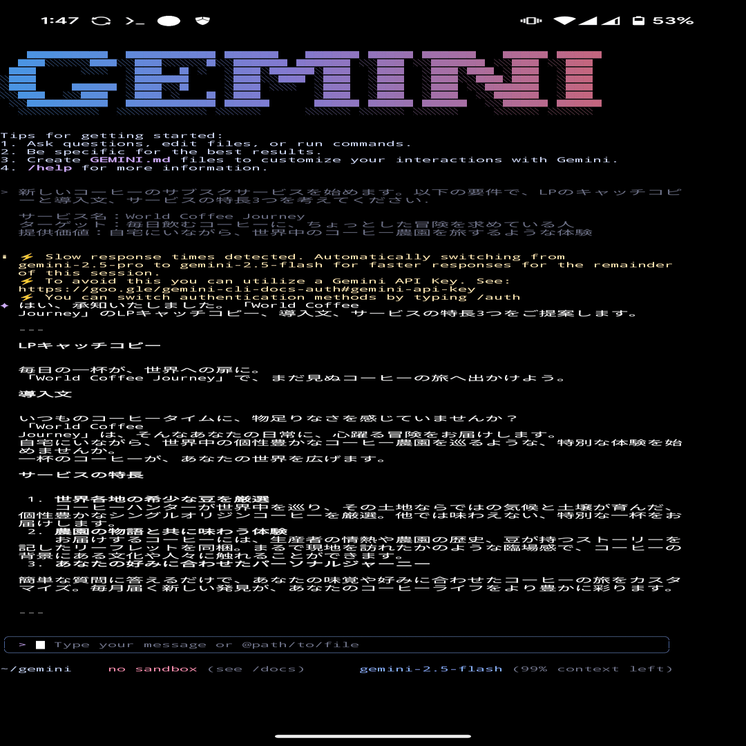 npm install -g @google/gemini-cliこれで、あなたのスマホにGoogle の最新AIが宿りました。PCもサーバーも一切使わずにです。