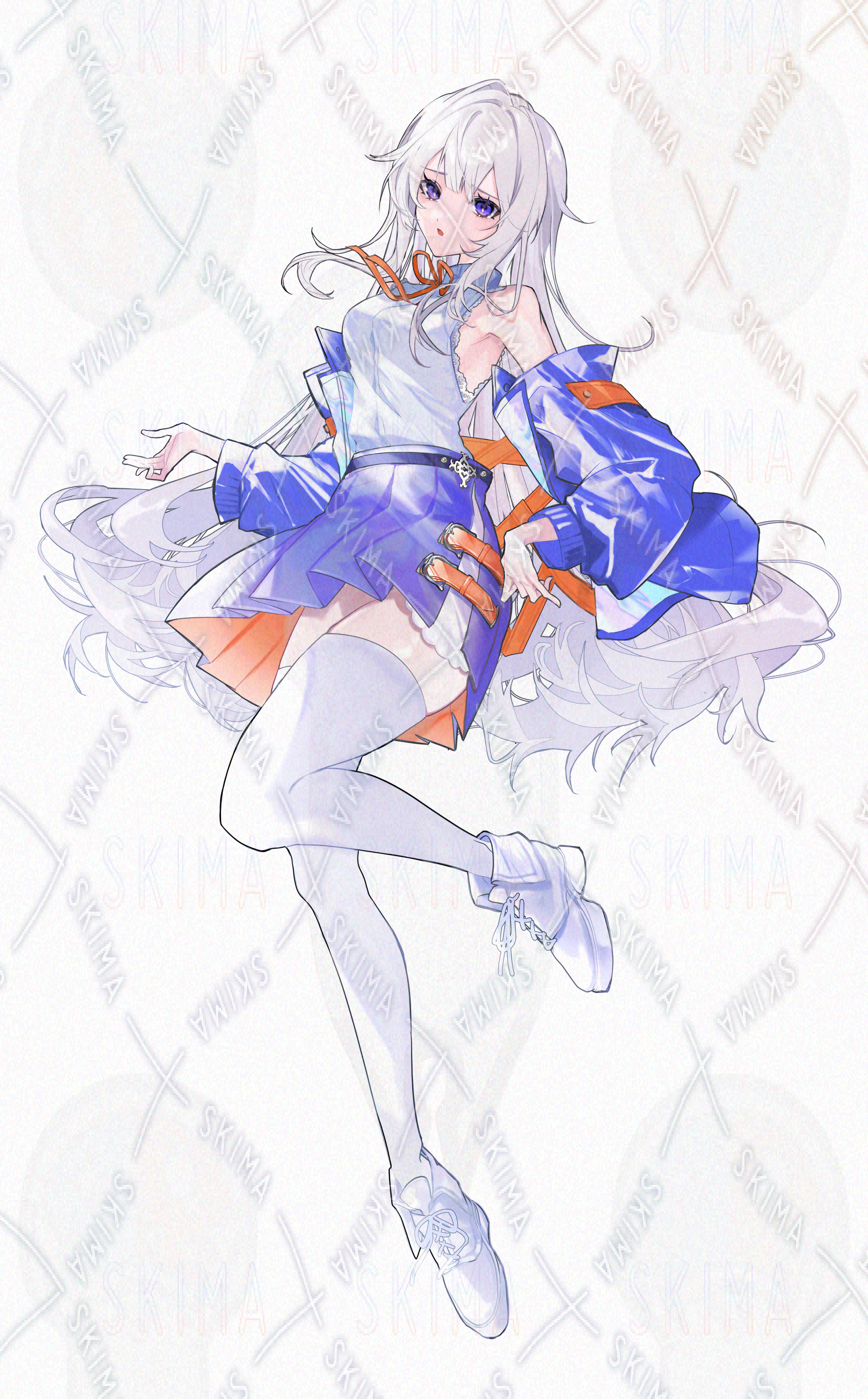 女性/少女/美少女/猫耳/猫尻尾/アンドロイド/宇宙/SF/ファンタジー/白髪/銀髪/ロングヘア/長髪/紫目/紺/夜/制服/ジャケット/学生/可愛い/綺麗