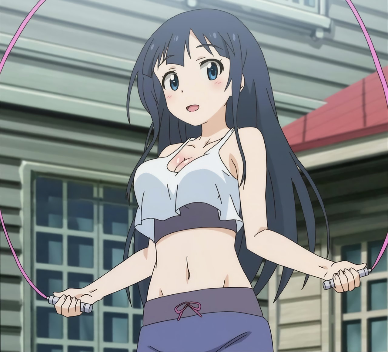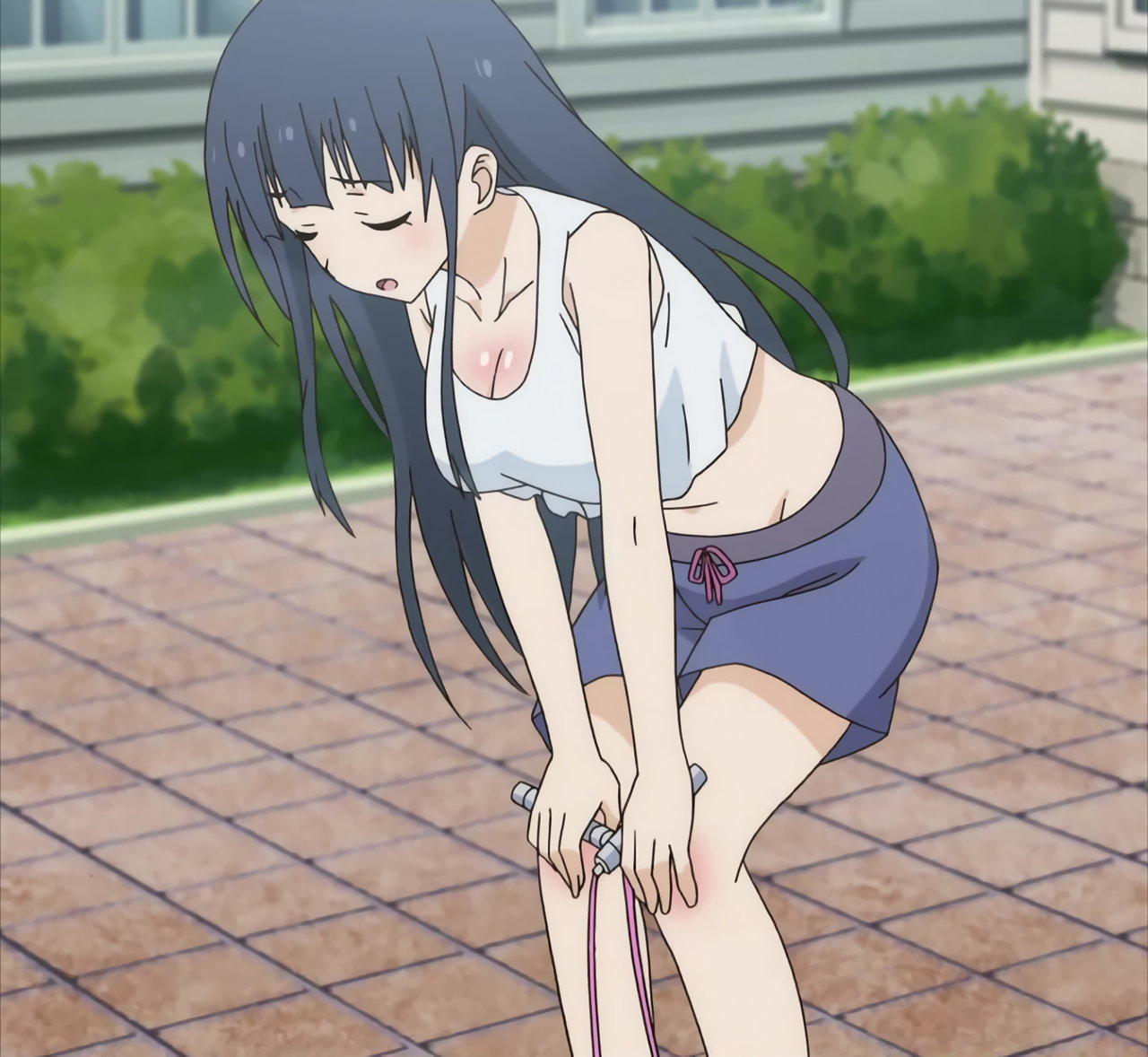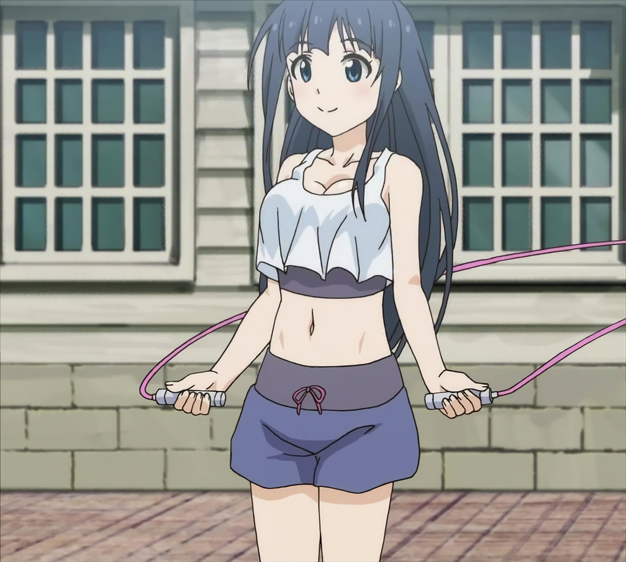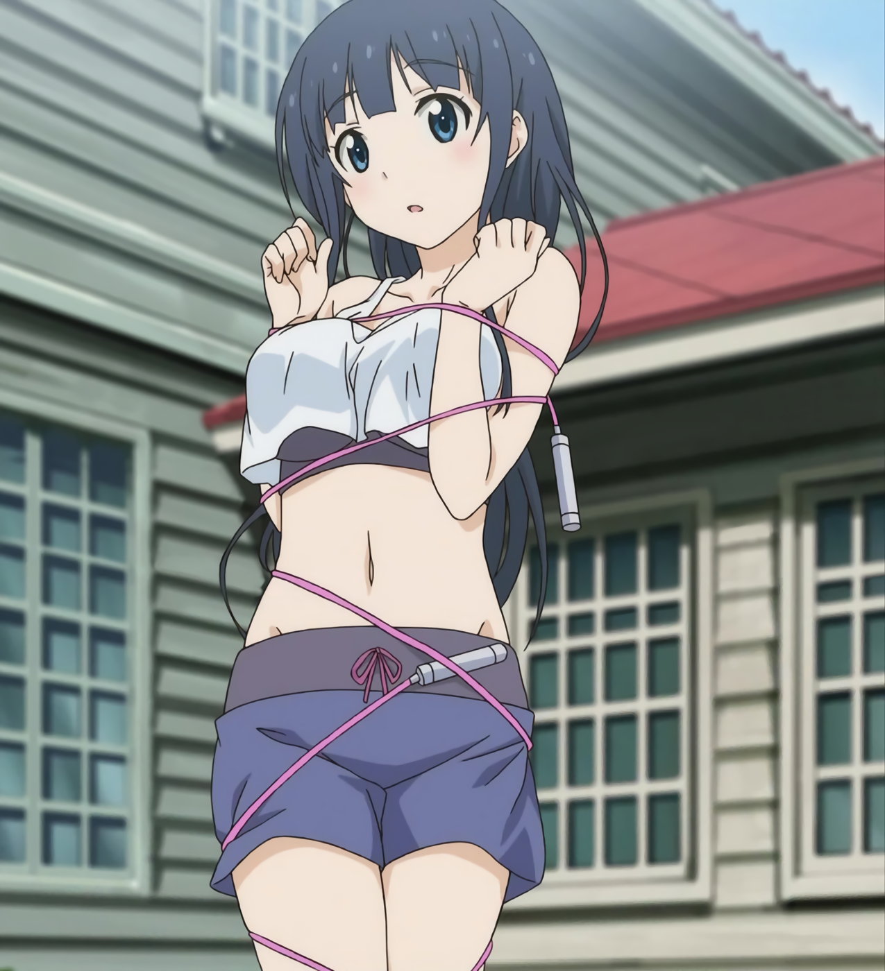 臍を見せ、巨乳を揺らしつつ、縄跳びをする静乃。