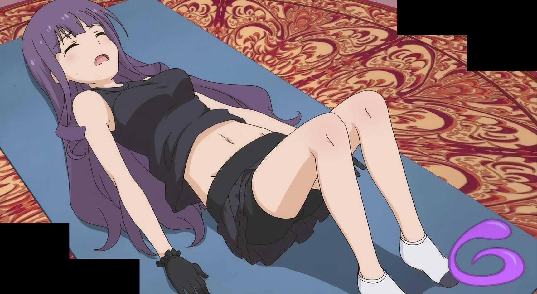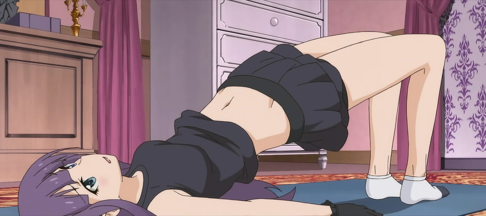 臍チラしつつ、スパイン・ヒップリフトをする紫苑。