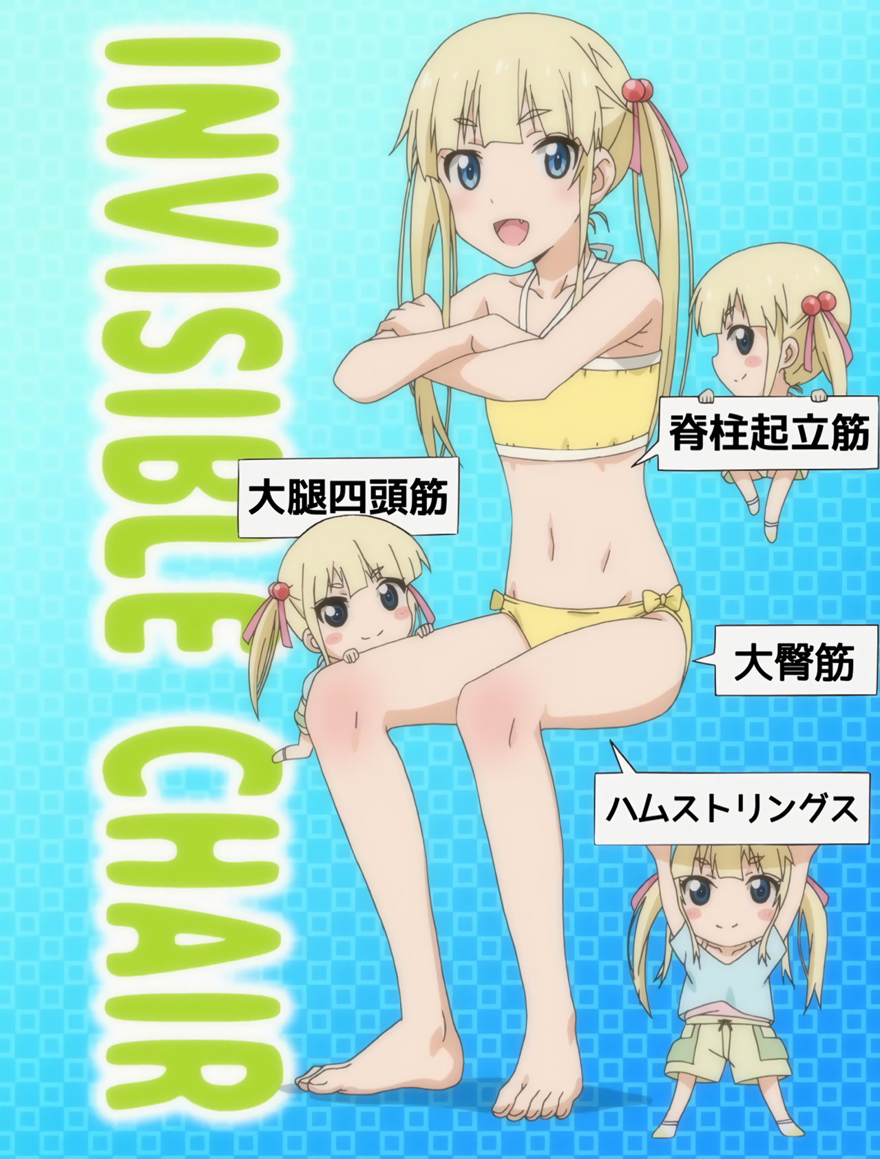 空気椅子・爪先立ち筋トレ法を解説する、下着姿のえり。