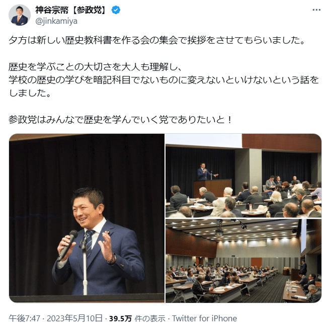 神谷宗幣は、吹田市議になる前から「極右カルト教育」に熱心で、この「つくる会」の影響を強く受けていたと思われ、2023年にも「つくる会」の集会で挨拶をしたことをツイートしています。