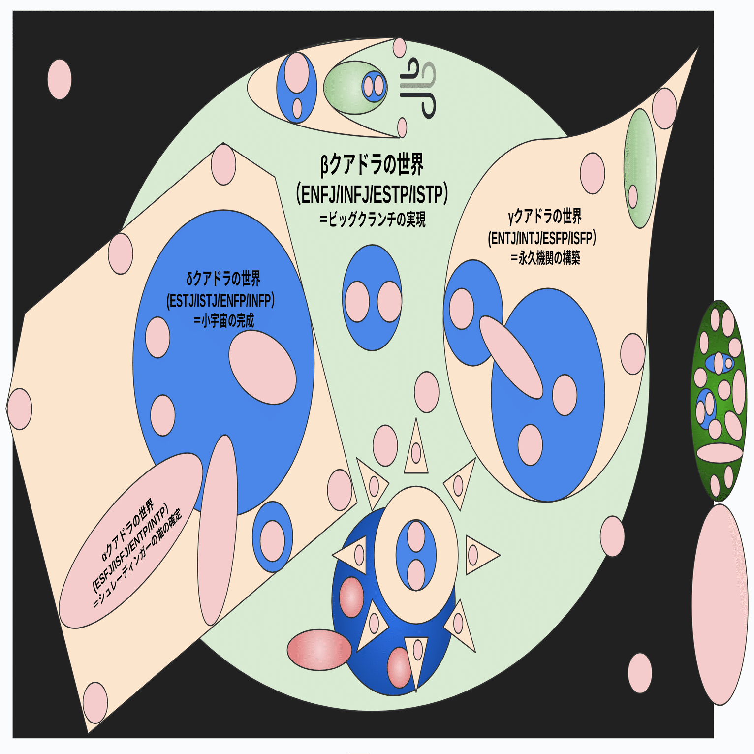 そんなこんなで当初やってた4時起き起業作戦会議は1ヶ月もせずに畳まれて、今は年に数回会うくらいの距離感だけど、ENFPが村長として大規模イベント開くからそこによくお邪魔してる。イベント実施のプランとかはいつもINTJとかにやらせてるみたい。なんかそれくらいが向いてると思うよ。