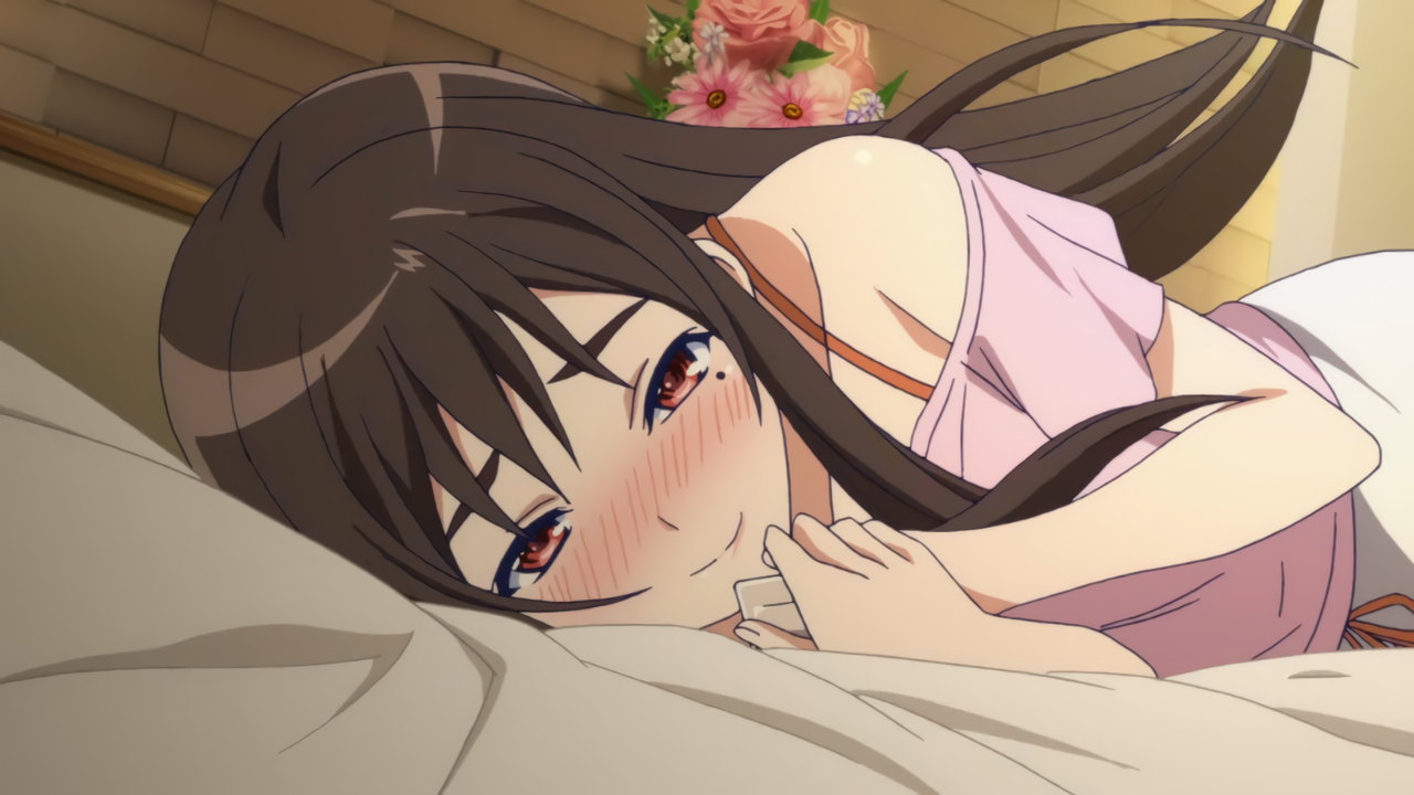 ベッドに寝転び、発情赤面中の小雪。