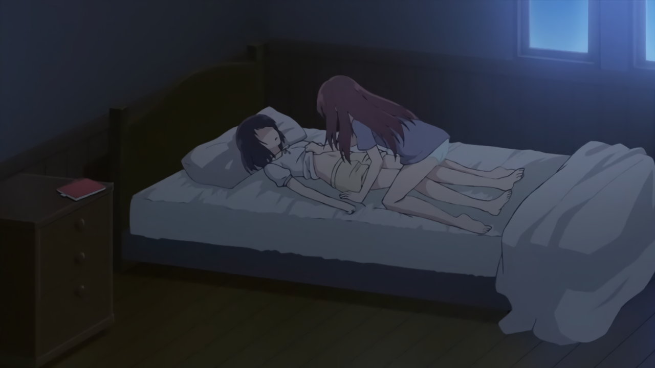 花火の寝込みを襲う、上半身Tシャツ・下半身パンツ一丁姿の早苗。