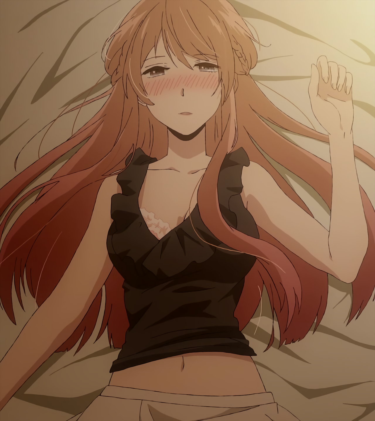鳴海の目の前で、酩酊赤面・ブラチラ臍チラ・性交お誘いポーズで寝そべる茜。