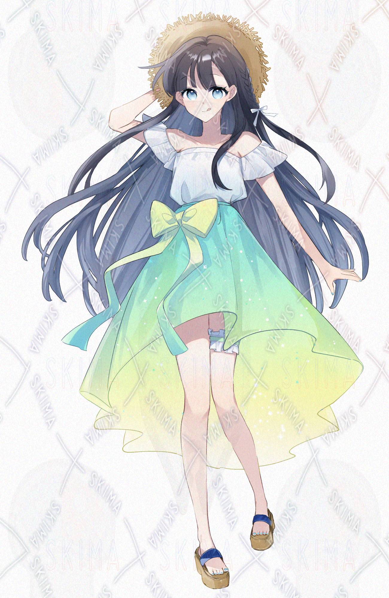 黒髪ロングのメロンソーダみたいなスカートを着た麦わら帽子の女性の立ち絵です。
