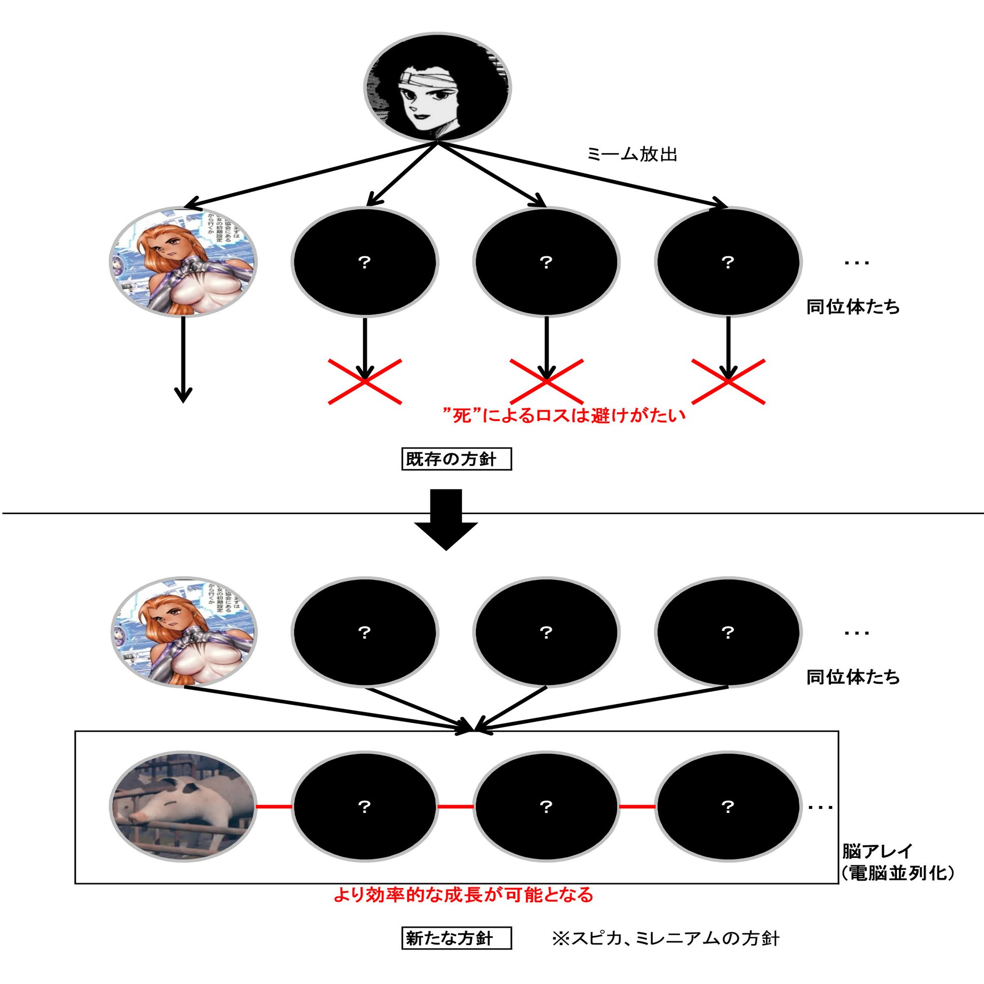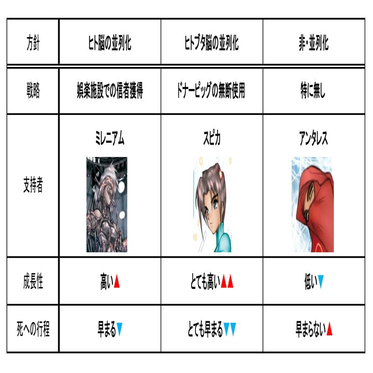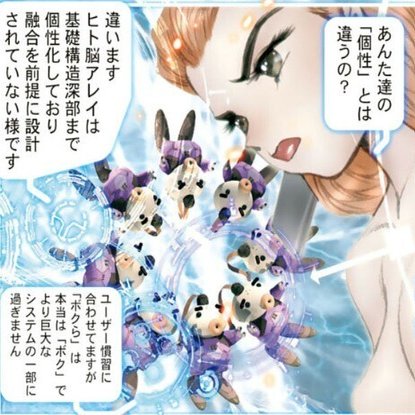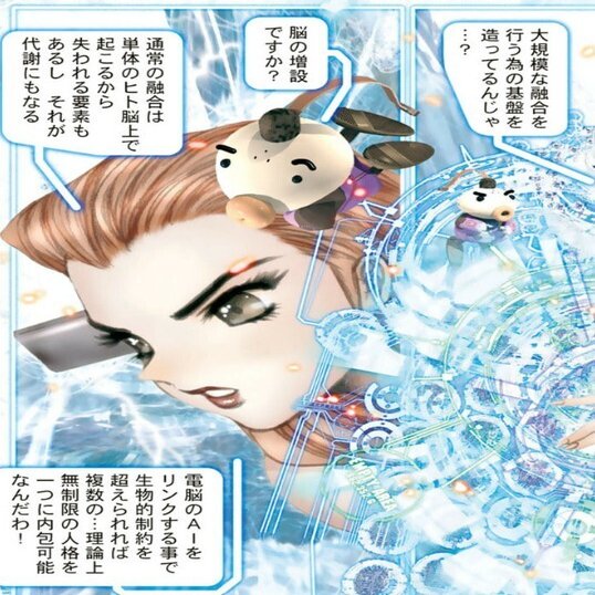 しかし、人間の電脳を並列化することで、無数の同位体が融合できるような容れ物を用意すれば、そのデメリットを回避できそうに思われます。個体の死による情報ロスを軽減して、より効率的な成長が望めるわけです。スピカ・ミレニアムによるヒト脳並列化の目的は、そこにあったのでしょう。それを理解した素子は「機械生命または不老不死の研究」と評します。