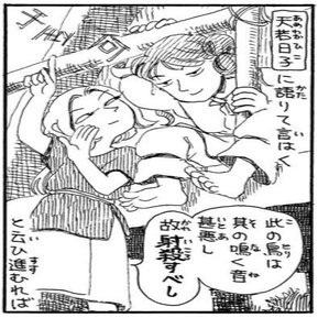 また、天邪鬼は記紀神話の天探女(アマノサグメ)が元になっていると言われているのですが、この天探女も素子の物語と繋がっています。古事記の「国譲り」には、天照大神(アマテラスオオミカミ)が天若日子(アメノワカヒコ)を地上に派遣するという場面があります。その天若日子に仕える女神が天探女です。彼女は天若日子をそそのかし、天界から遣わされたキジを射殺させます。しかし、その射殺した矢が天界まで届いてしまい、天界からの還矢(カエシヤ)で天若日子は死を迎えます。