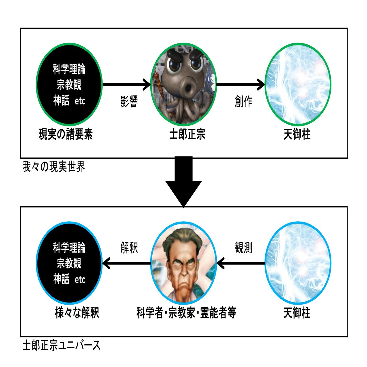逆に言えば、特定の宗教や神話が描かれているわけではないようです。科学や宗教、神話に関する知識を吸収した士郎正宗による、オリジナルの世界観です。しかし、作中の登場人物は各々の科学や宗教に基づいてそれを解釈しています。下図のように、創作の順序と作品内での解釈の順序が逆向きになっているわけです。「なんでそんな当たり前の話をしてるんだ」と思われるかもしれませんが、理解に詰まる人も多い箇所だと感じます。