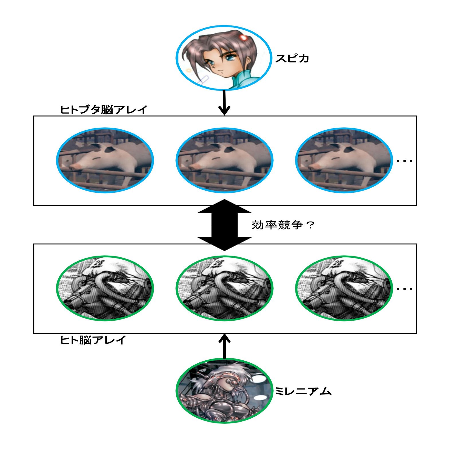 さて、草薙の脳内で再調査をおこなった結果、ミレニアムの戦略の全体像が見えてきます。ミレニアムはエンタメ施設で人材を集め、その脳を並列化して利用しているようです。前回も述べた通り、「脳を並列化する」という点において、ミレニアムの戦略はスピカのヒトブタ脳と似通っています。しかし素子のAIによると、効率の面ではスピカの方が優れており、ミレニアムのスターバトマーテルは一歩劣っていたようです。そうした効率競争の果てに、スピカとミレニアムの対立が発生し、ブタ工場襲撃に至ったのかもしれません。素子はようやく事件の全体像を把握し始めます。