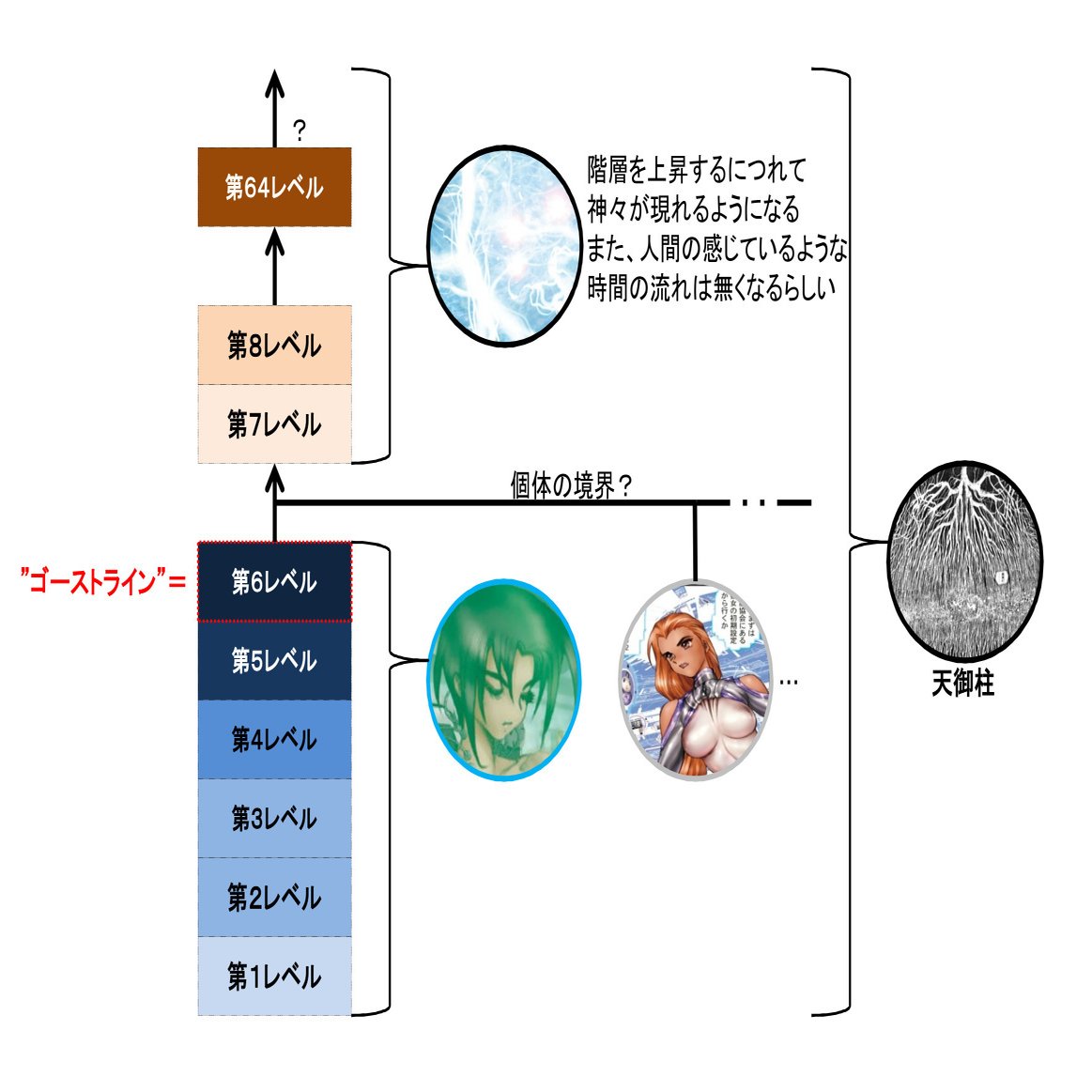 脳の階層構造の最深部、人格を規定する第6レベルを「ゴーストライン」と言います。霊能者や素子同位体のような特殊な人間は、それより深い第7レベル以降も認識できるようになっています。第7レベル以降は個々人の脳の範疇を離れ、情報量が莫大に増加するようです。つまり、脳もまた森羅万象で編まれた巨大なネットの一部であり、全ては繋がっているということですね。これは、攻殻を読み解くうえで割と重要な設定だと思われます。