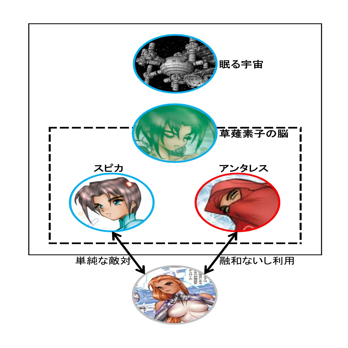 ところが、この「大規模融合による成長」に反対する者がいました。アンタレスです。草薙素子の片われ・スピカが大規模融合を推し進めているにも関わらず、もう片方のアンタレスはそれに反対しているのです。