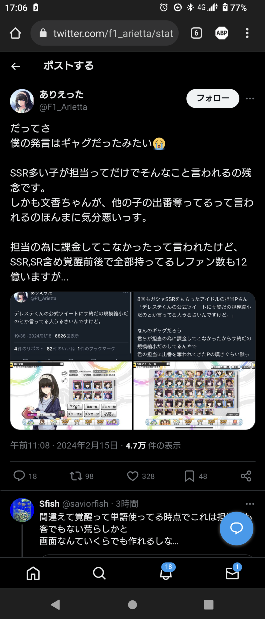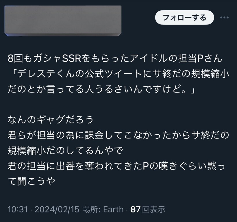 8回もガシャSSRをもらったアイドルの担当Pさん「デレステくんの公式ツイートにサ終だの規模縮小だのとか言ってる人うるさいんですけど。」