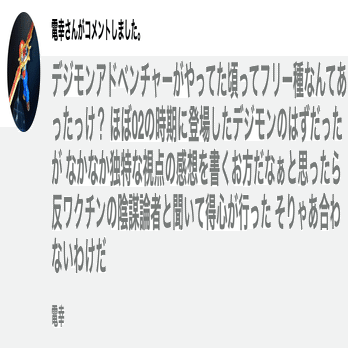 事の発端は、俺が書いた「デジモンアドベンチャー」の批評記事で、まあ、ご存知の通り俺は思ったことをストレートに書く主義だから、批判的な意見も容赦なくぶちまけるわけだ。そしたら、そこに湧いて出たのが、この「電幸」という御仁で。